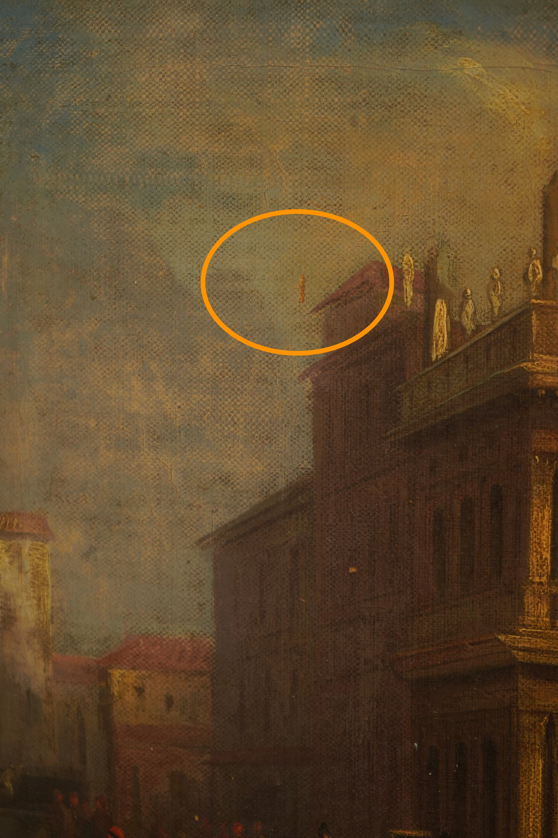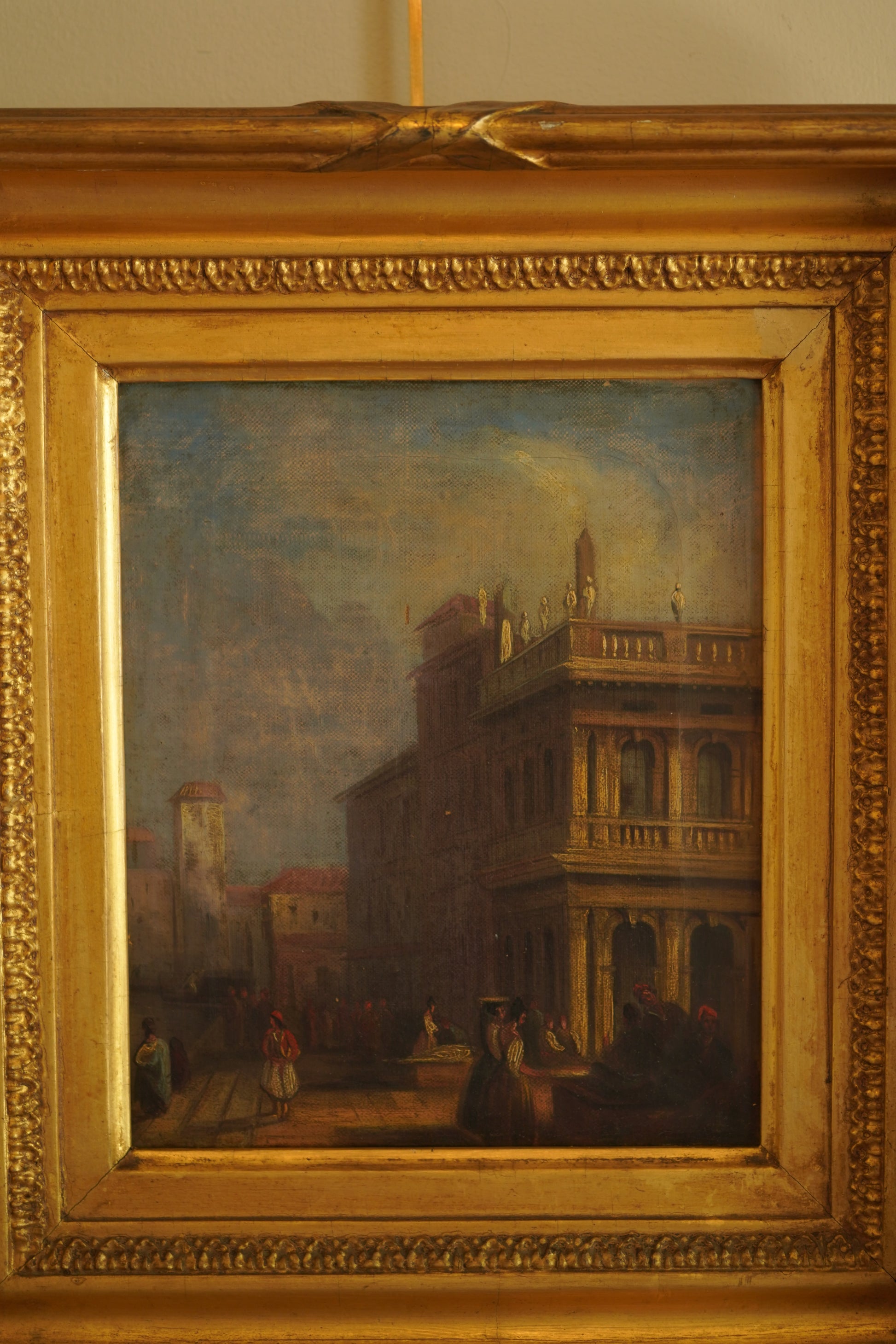 Paintings such as this were highly sought after during the Grand Tour era, when wealthy travelers collected cabinet-sized oils as romantic souvenirs of Europe’s greatest cities. Following the tradition of Venetian masters like Francesco Guardi and Michele Marieschi, the artist combines architectural grandeur with animated human detail, evoking both the civic pride and daily rhythm of Venice.