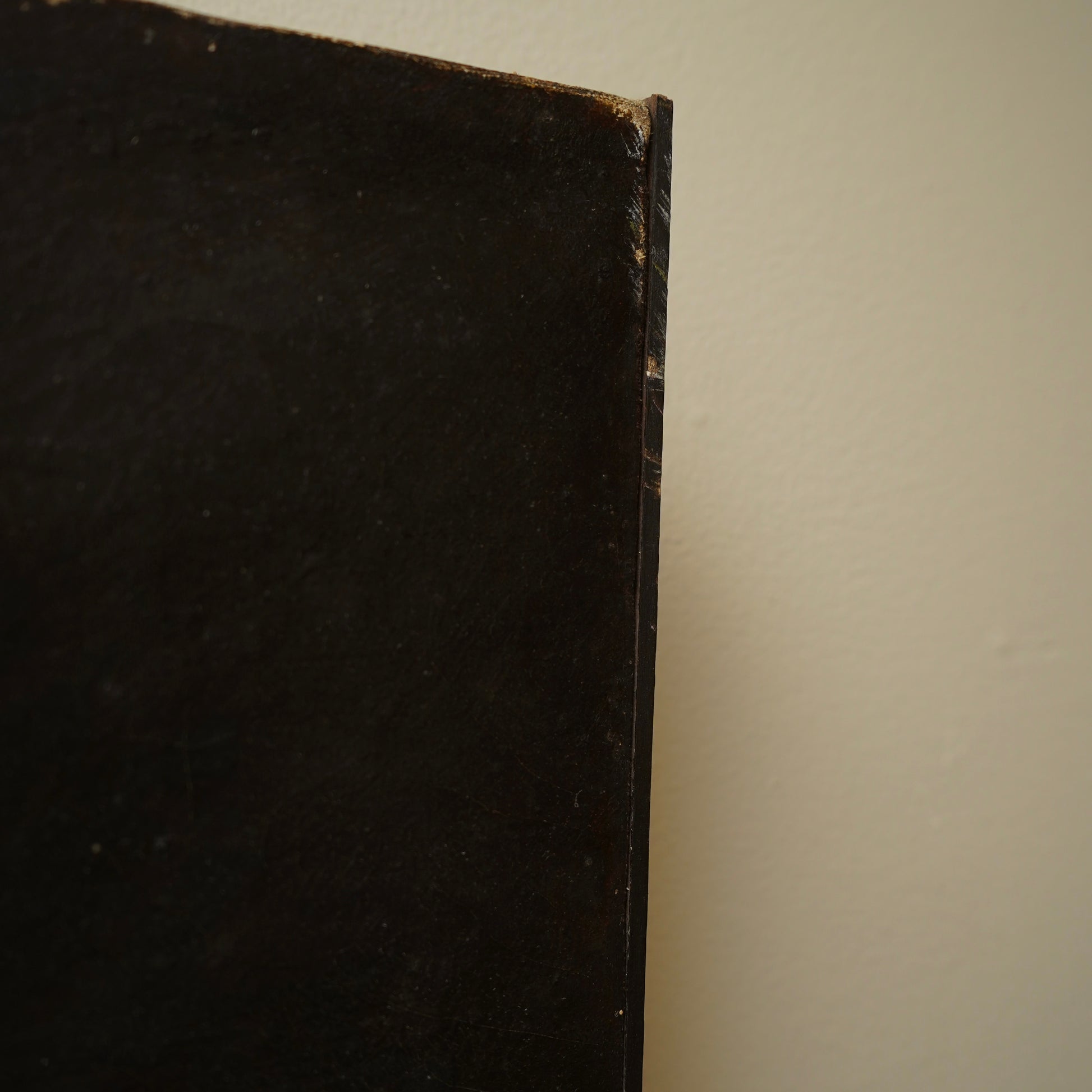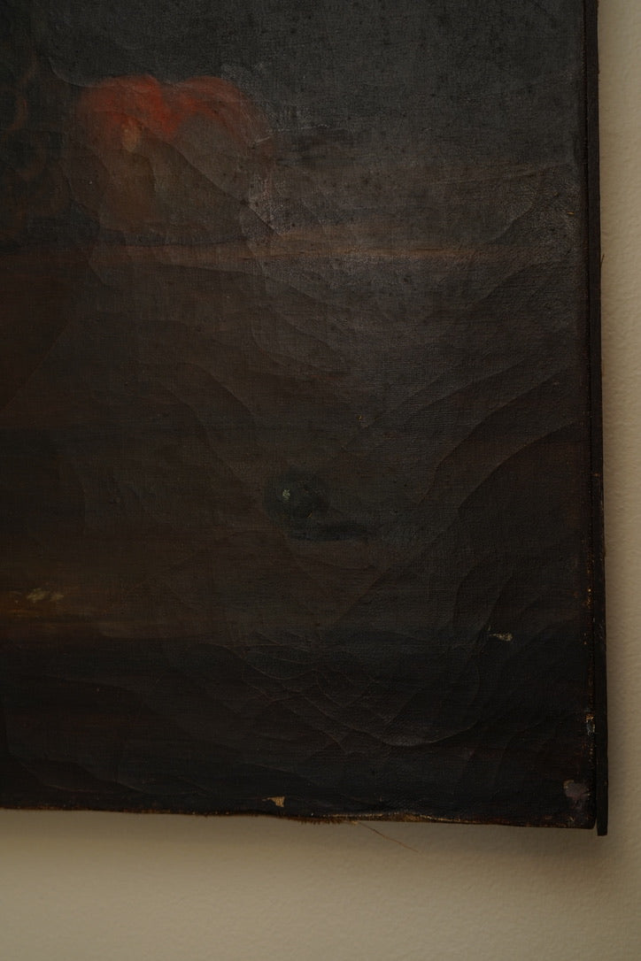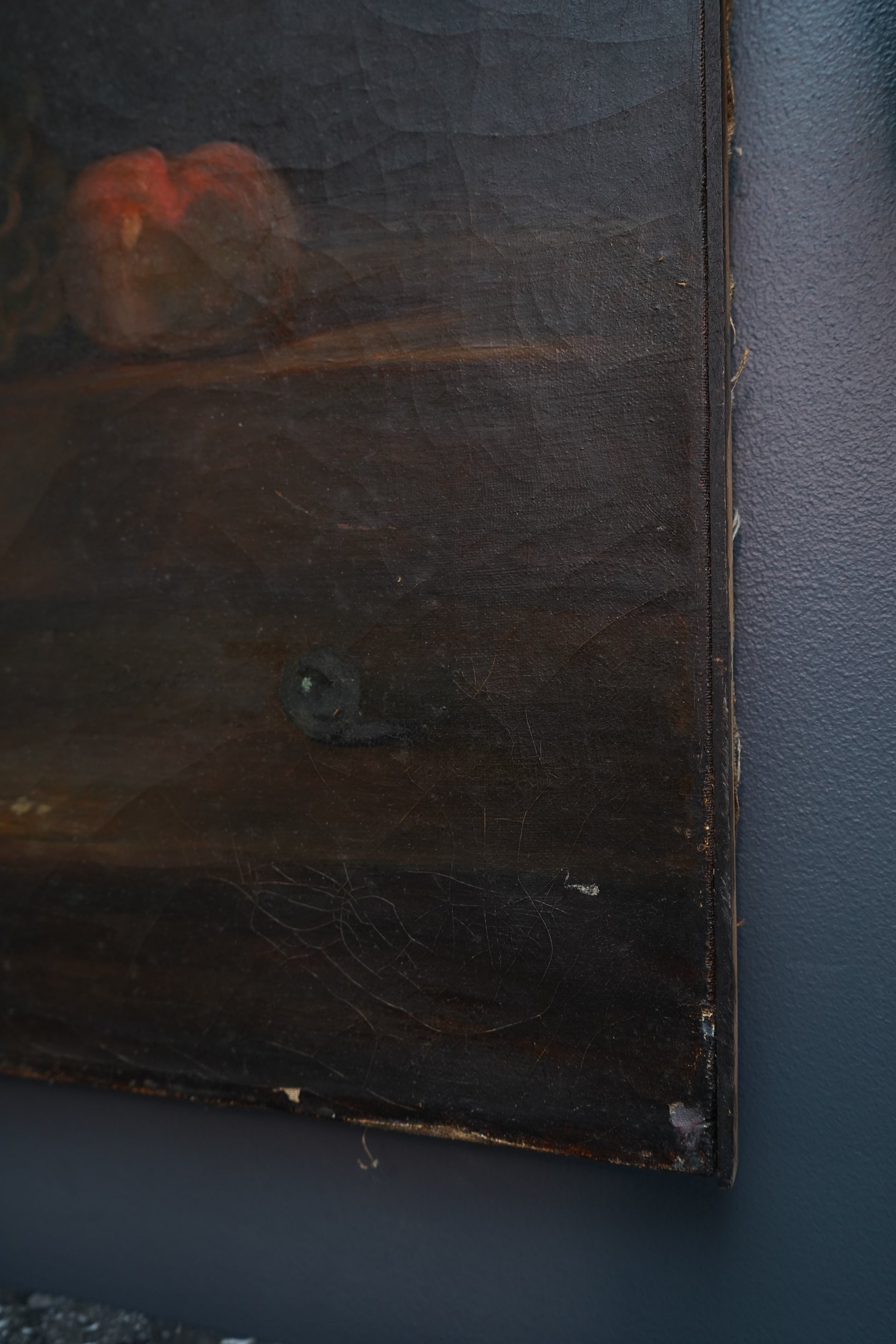 The painting shows light surface discoloration to the varnish with areas of craquelure consistent with age. There are minor stains and light edge wear to the canvas, but the overall structure remains stable and sound. No significant paint losses or tears are present.