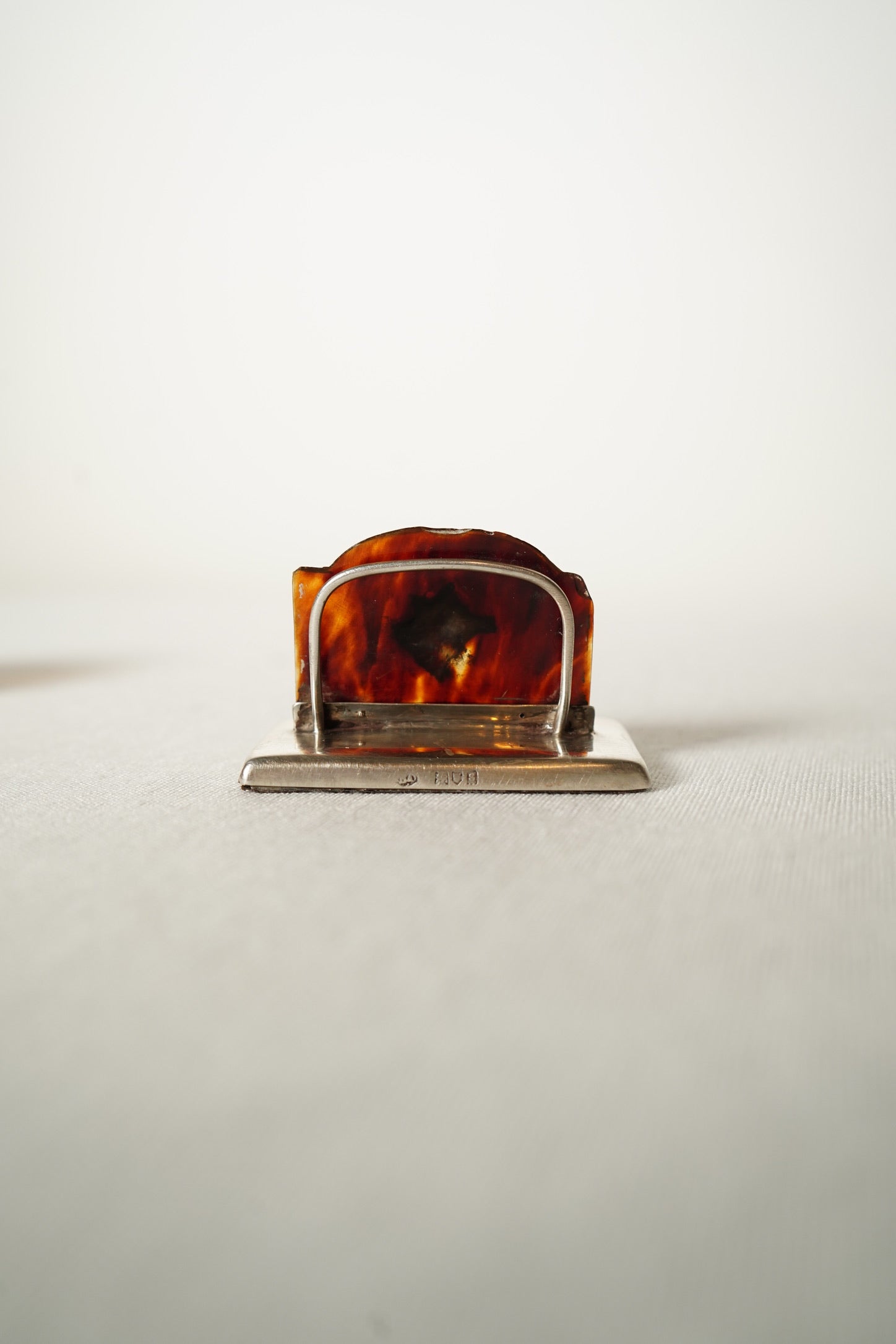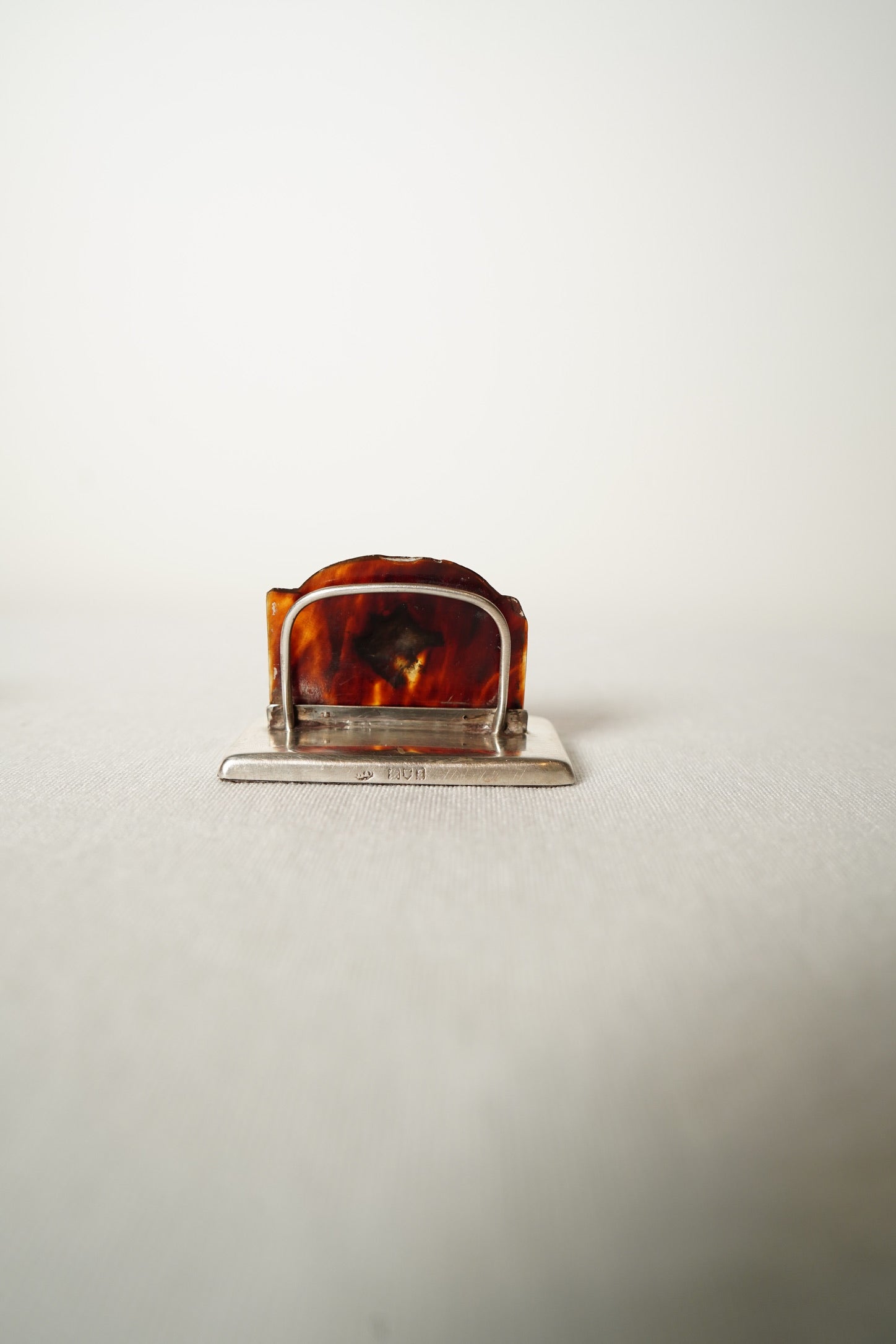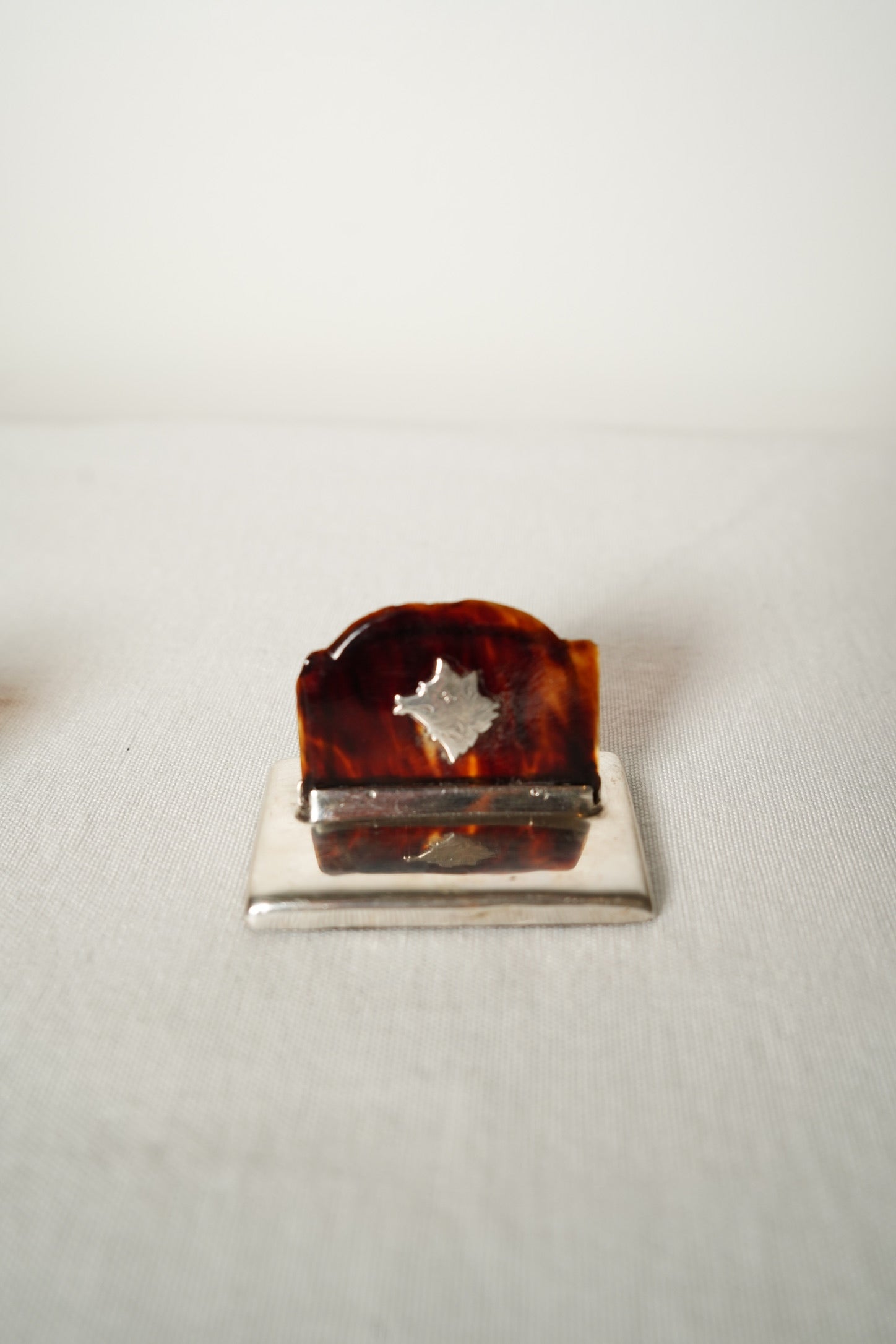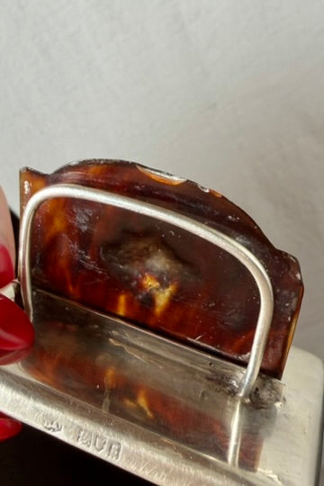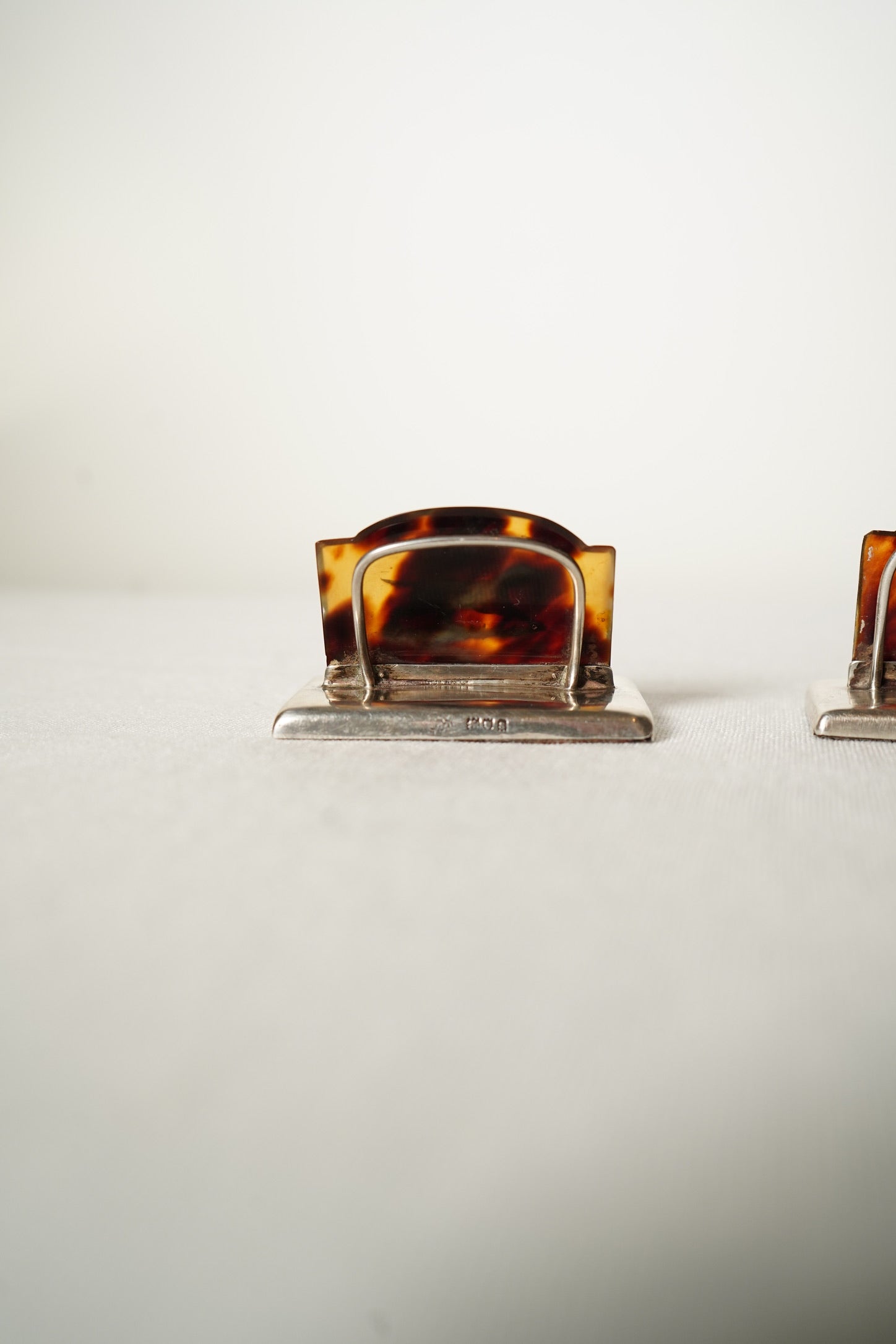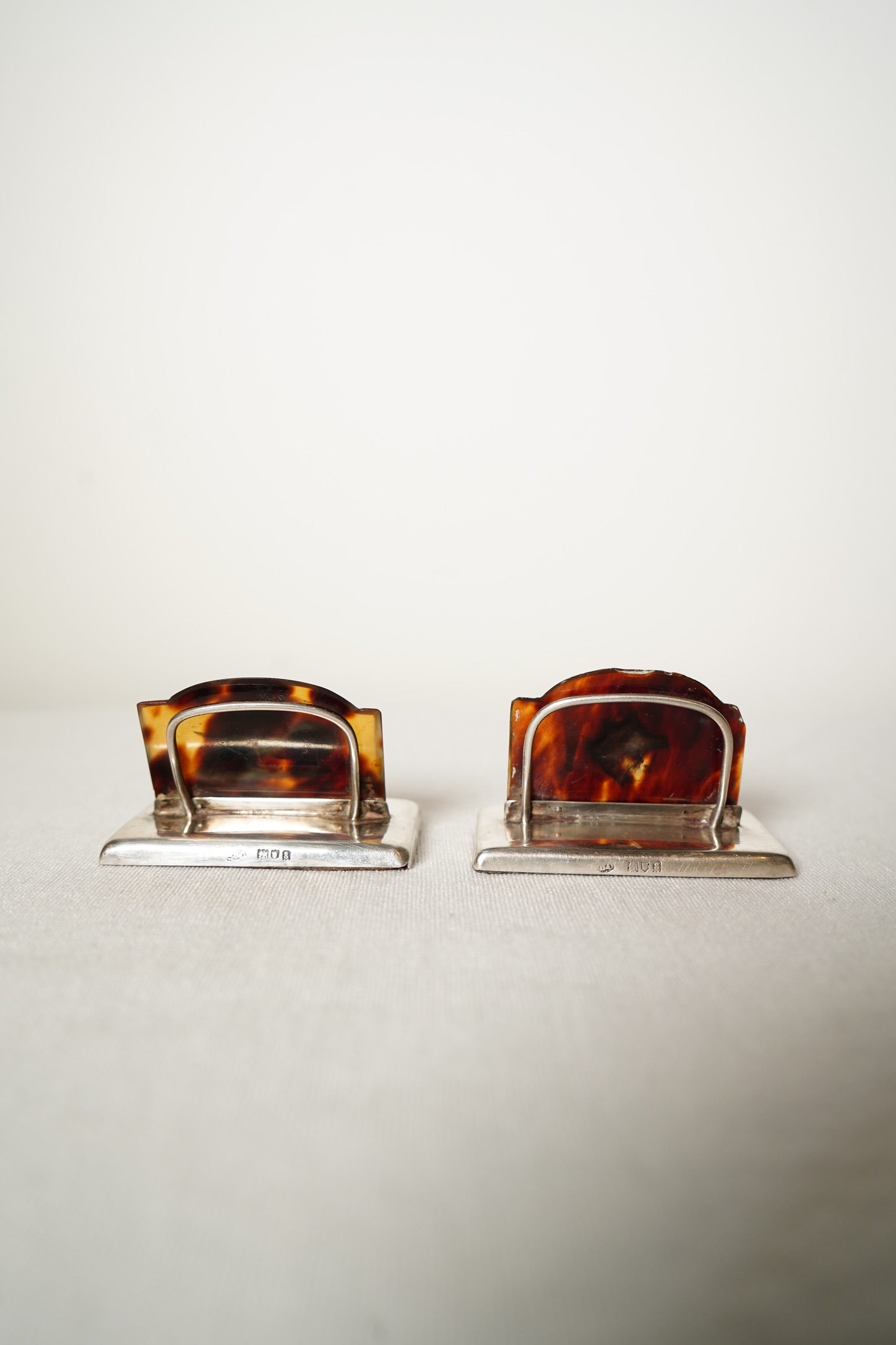 Both holders are in very good antique condition with age appropriate wear. The genuine tortoiseshell panels show natural variation in tone with light surface marks and a few tiny edge nibbles from age. The sterling silver bases show faint scratches, small dimples and gentle rubbing consistent with handling over time. The hallmarks are partially worn but remain identifiable. The silver dog and boar’s head motifs are secure and well defined. Both pieces stand straight, sit flat and present beautifully.