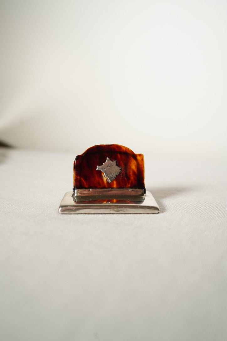 One holder displays a silver inlaid sporting dog, likely a setter or pointer in classic field stance, a motif closely associated with Edwardian sporting culture. The second shows a silver boar’s head cartouche, a heraldic symbol traditionally representing courage and loyalty. Together they tell a distinctly English story of estate life and gentlemen’s club elegance. Perfect for place cards while hosting, menus for intimate dinners or as a refined business card holder on a desk, this pair adds a timeless heritage touch to any space.