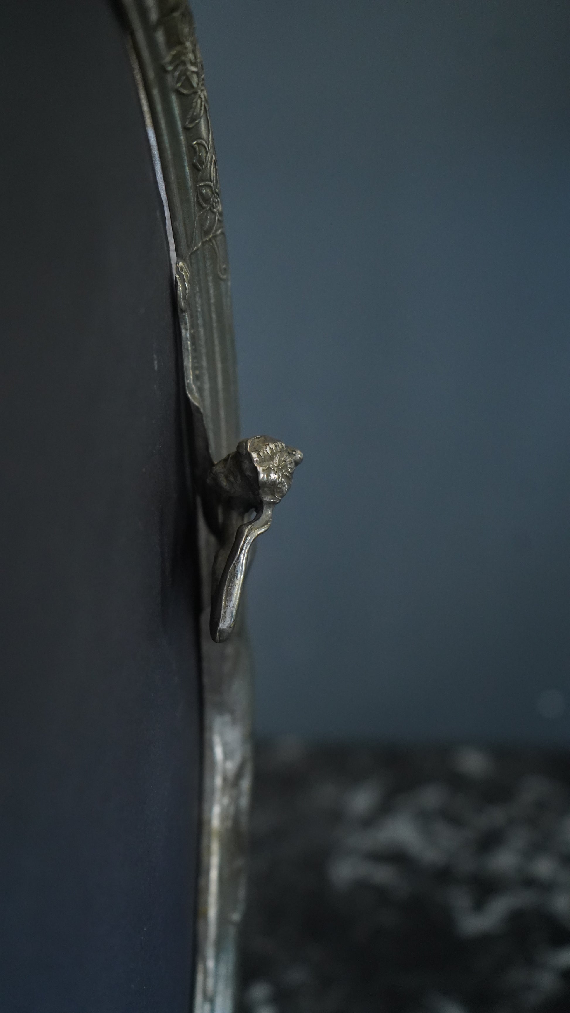 The frame shows age-appropriate wear to the silver-plated surface, including areas of darkening, light spotting, and minor surface marks consistent with use. It is missing the original mirror that would have been mounted in this frame. The velvet backing appears to be a later replacement and the hanging hardware has been updated. Overall, the frame is in good antique condition and displays beautifully.