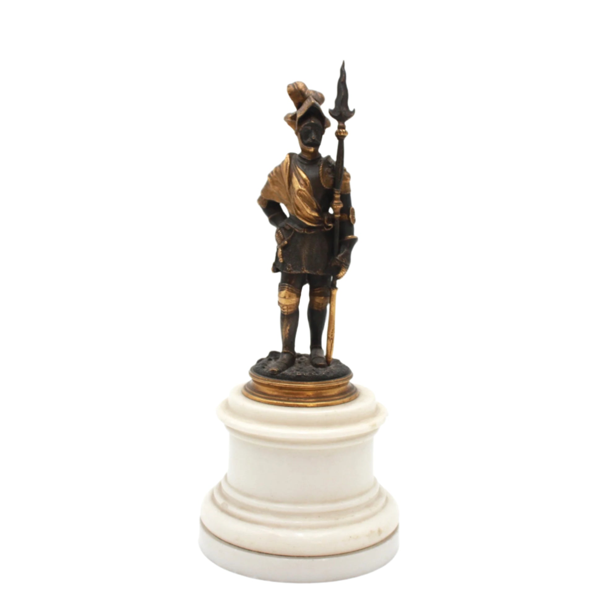 This antique French bronze figure of a Renaissance soldier is a striking example of late 19th-century craftsmanship. Cast in parcel-gilt bronze with beautiful fire-gilded accents, the figure depicts a Landsknecht-style halberdier in full Renaissance attire. He stands confidently atop a turned white marble plinth, elevated further by a sculpted giltwood base with beaded trim and bun feet. Pieces like this were popular during the Renaissance Revival period in Paris, particularly among collectors furnishing Haussmann-era interiors. Originally part of a garniture set flanking a mantel clock, this surviving figure now makes a captivating standalone sculpture. Its scale is ideal for bookshelves, desktops, or styled consoles, where it adds historical depth and continental elegance. The combination of dark patina, gold accents, and clean white marble offers a timeless contrast that remains just as stylish today as it was in 1880.