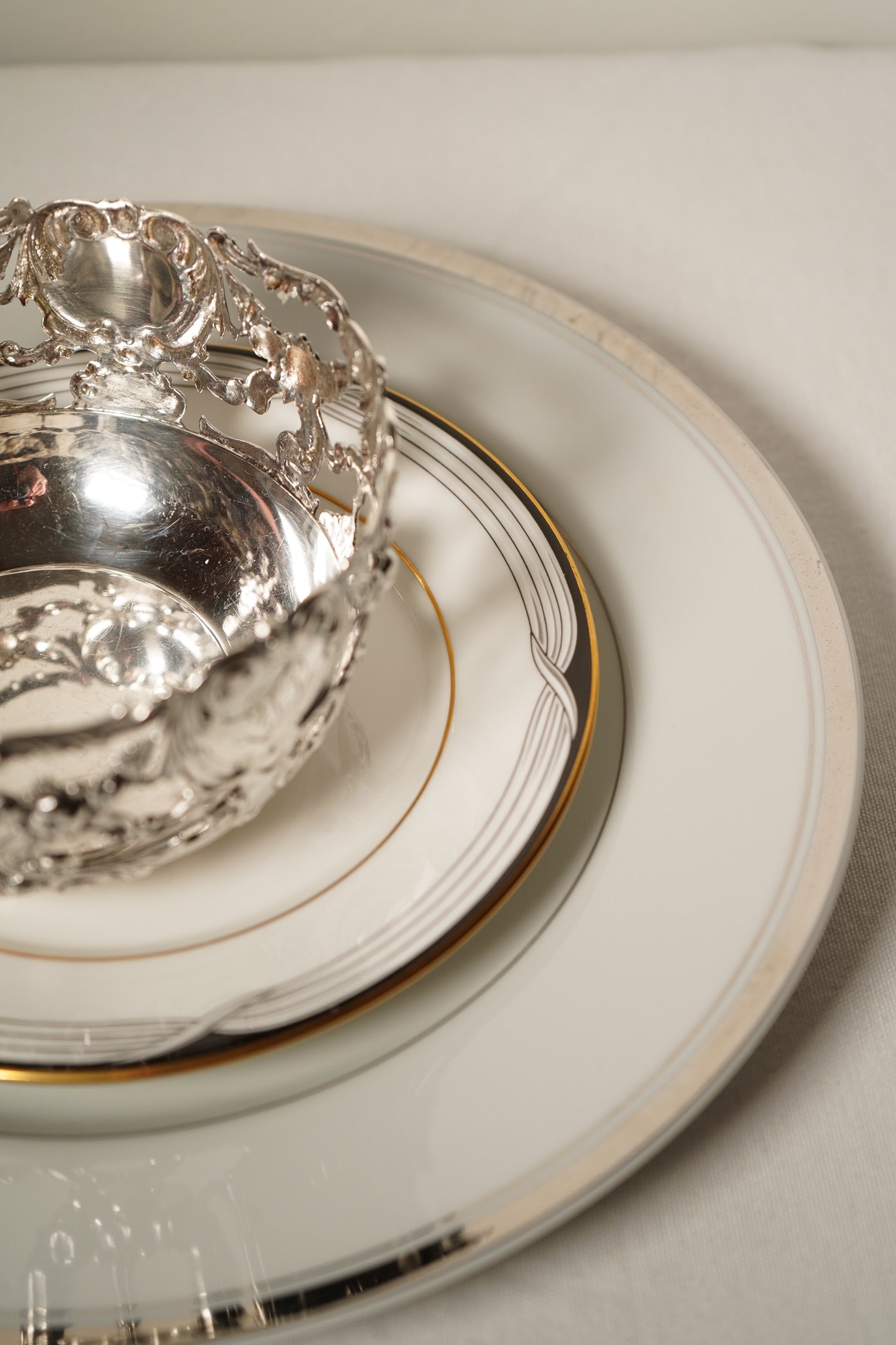A timeless classic for an elevated table, this set of 2 Lenox Wallace Heritage Newport dinner plates features a crisp white porcelain body finished with a refined silver rim. The clean double banding and minimalist silhouette reflect mid century American design trends that valued understated luxury and hotel level refinement. Crafted in Japan for Lenox’s Wallace Heritage line, the Newport pattern became popular for its quiet sophistication and compatibility with both formal and modern table settings. These plates pair beautifully with sterling silver flatware, monochromatic linens, or a layered Ralph Lauren inspired tablescape. Whether you use them for special occasions or for daily elevated dining, they bring an elegant, timeless presence to any collection.