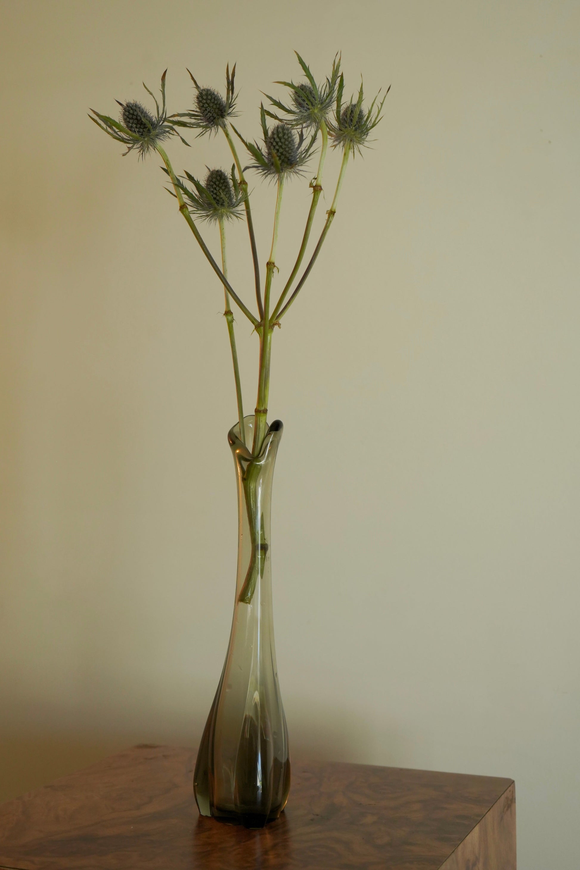 Viking was known for its bold, sculptural glass in rich colors, and this smoky charcoal tone fits perfectly into the more neutral, earthy palette that's become so desirable in today's design world. The vase blends organic fluidity with geometric structure, exactly what makes Mid-Century American glass so collectible.