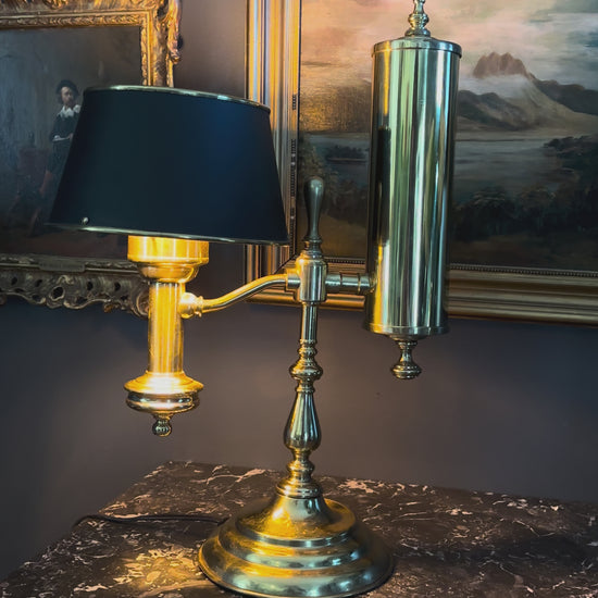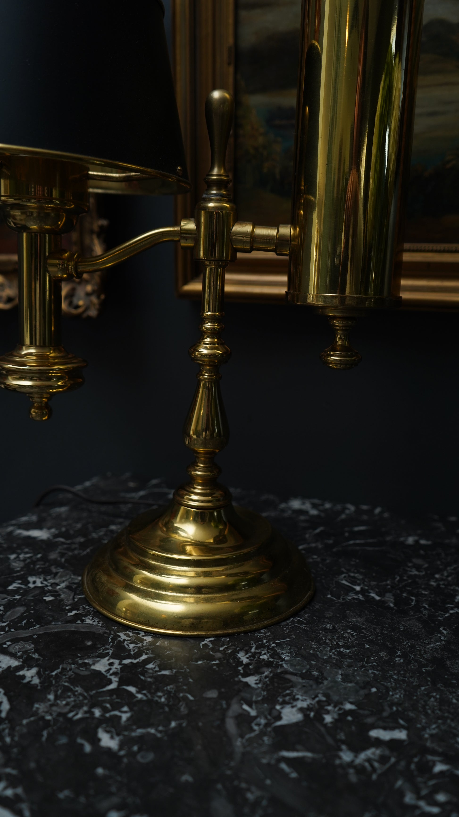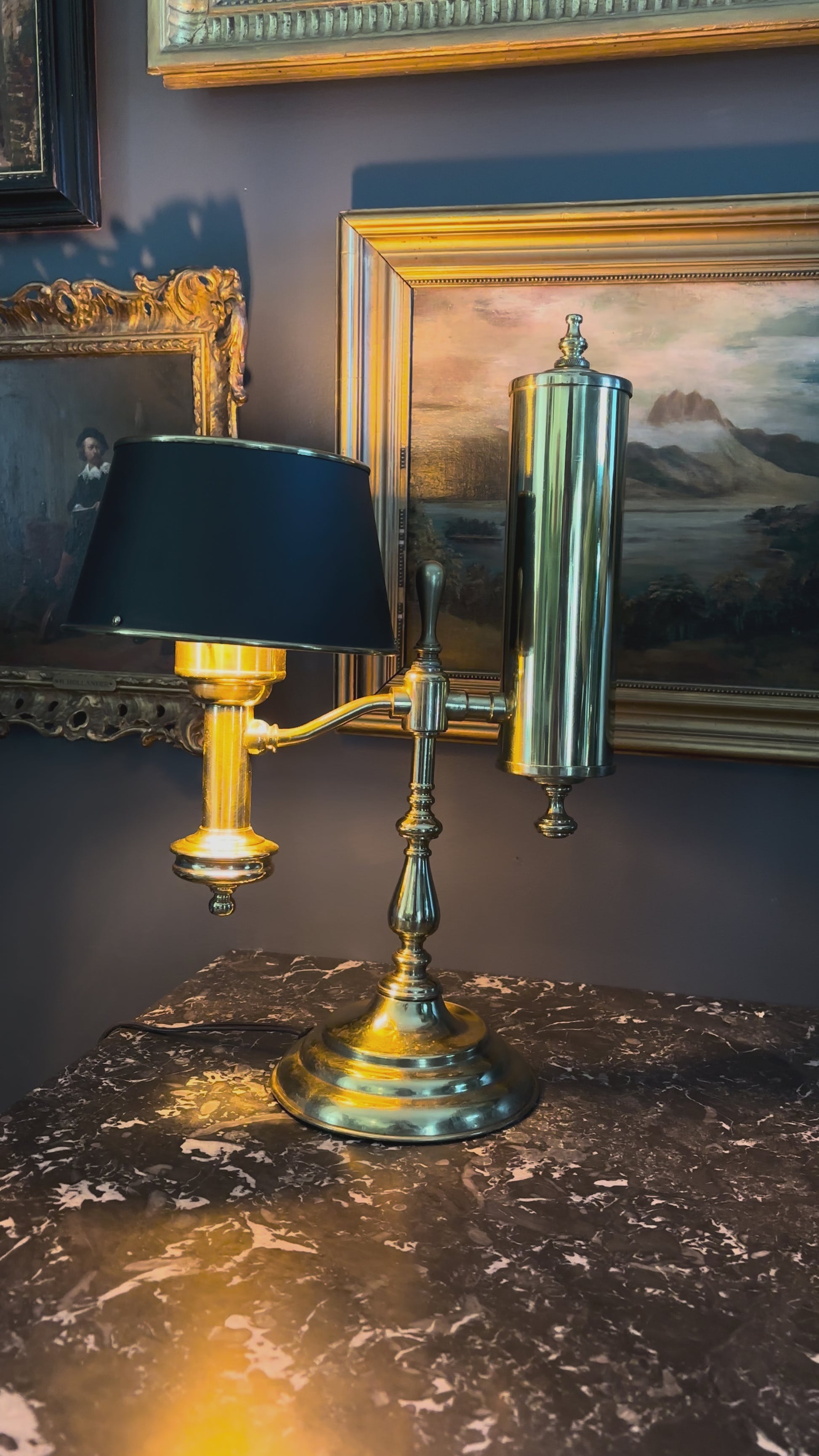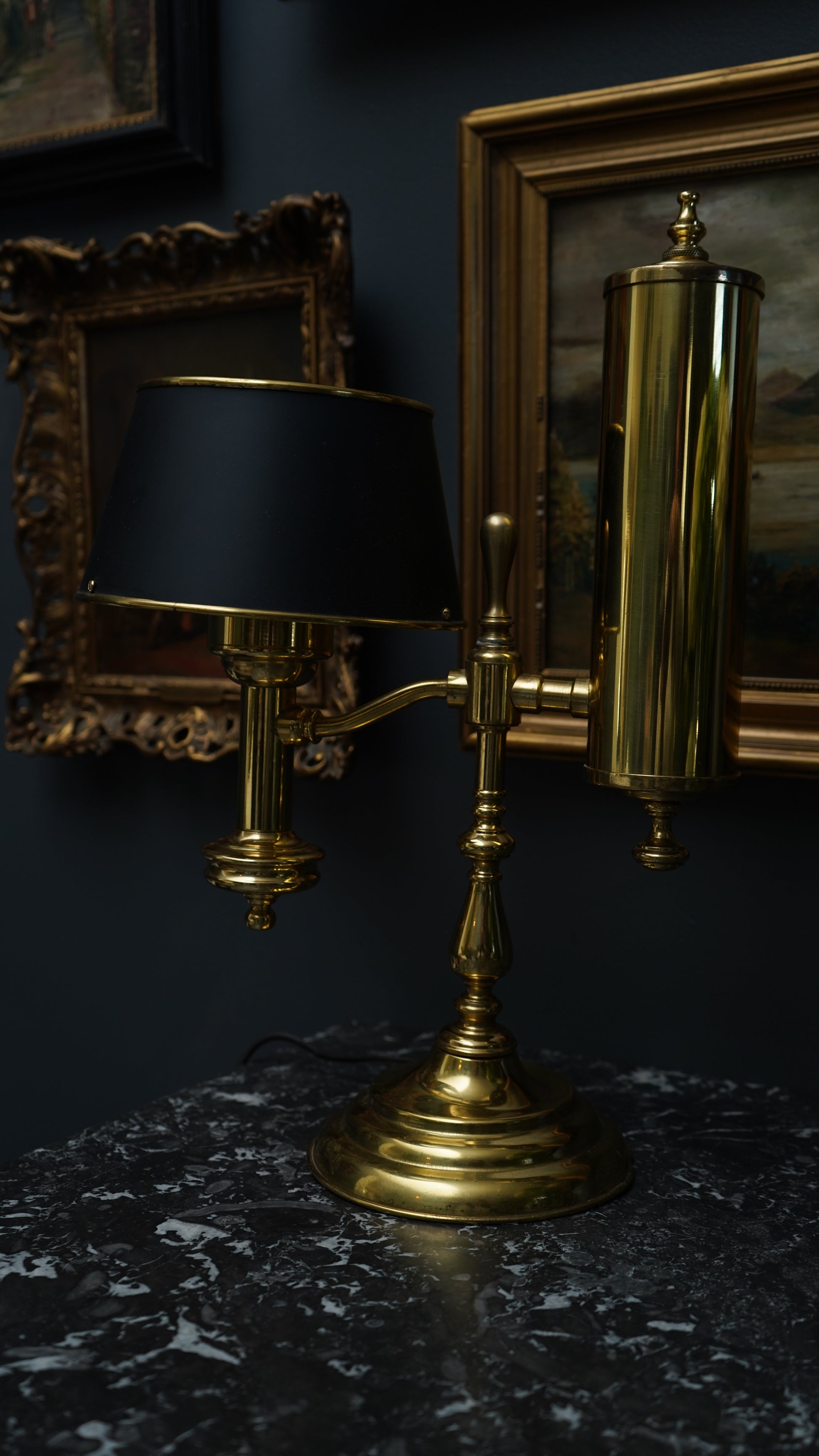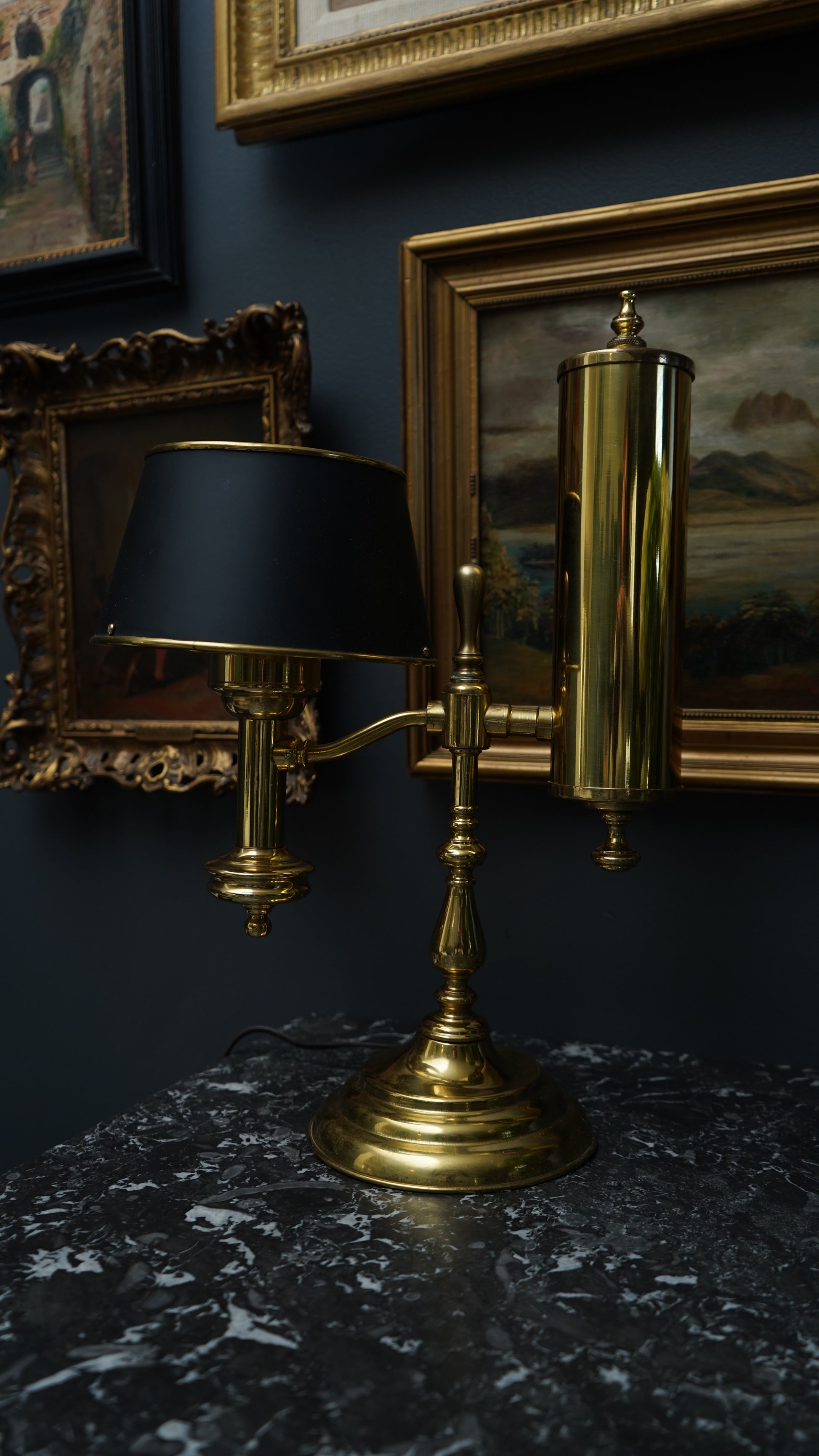 This vintage brass bouillotte lamp brings that classic English library feel into any space. The solid brass body has developed a warm, authentic patina that only decades of use can create. It is paired with a timeless black metal shade that gives the piece a refined, moody presence when lit. The lamp has been freshly rewired for modern use and is ready to style on a desk, console, or bedside table. Its adjustable column and traditional silhouette reflect the French bouillotte lamps of the nineteenth century that were originally designed for card games and intimate evening lighting. This one blends that history with a sleek updated shade for a polished and sophisticated look.