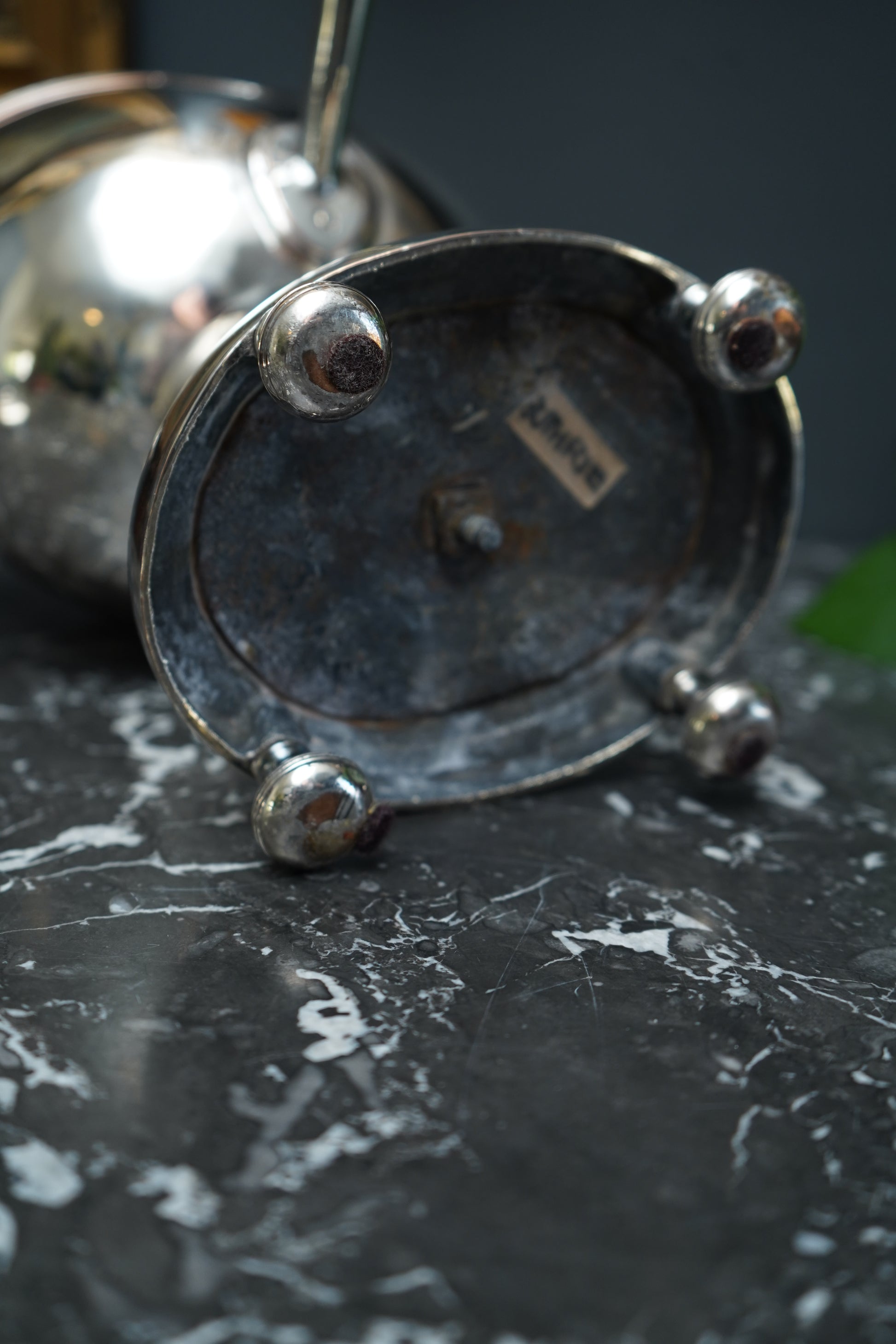 The samovar remains in good antique condition with age-appropriate wear to the silver plating, particularly on the interior and underside. The surface shows light scratches and signs of use consistent with its history. The spout and handles are sturdy and functional, with the ivory/bone tap handle intact. Some tarnish and patina add to its authentic antique character. Overall, this is a well-preserved example ready to be displayed or used as a statement piece.