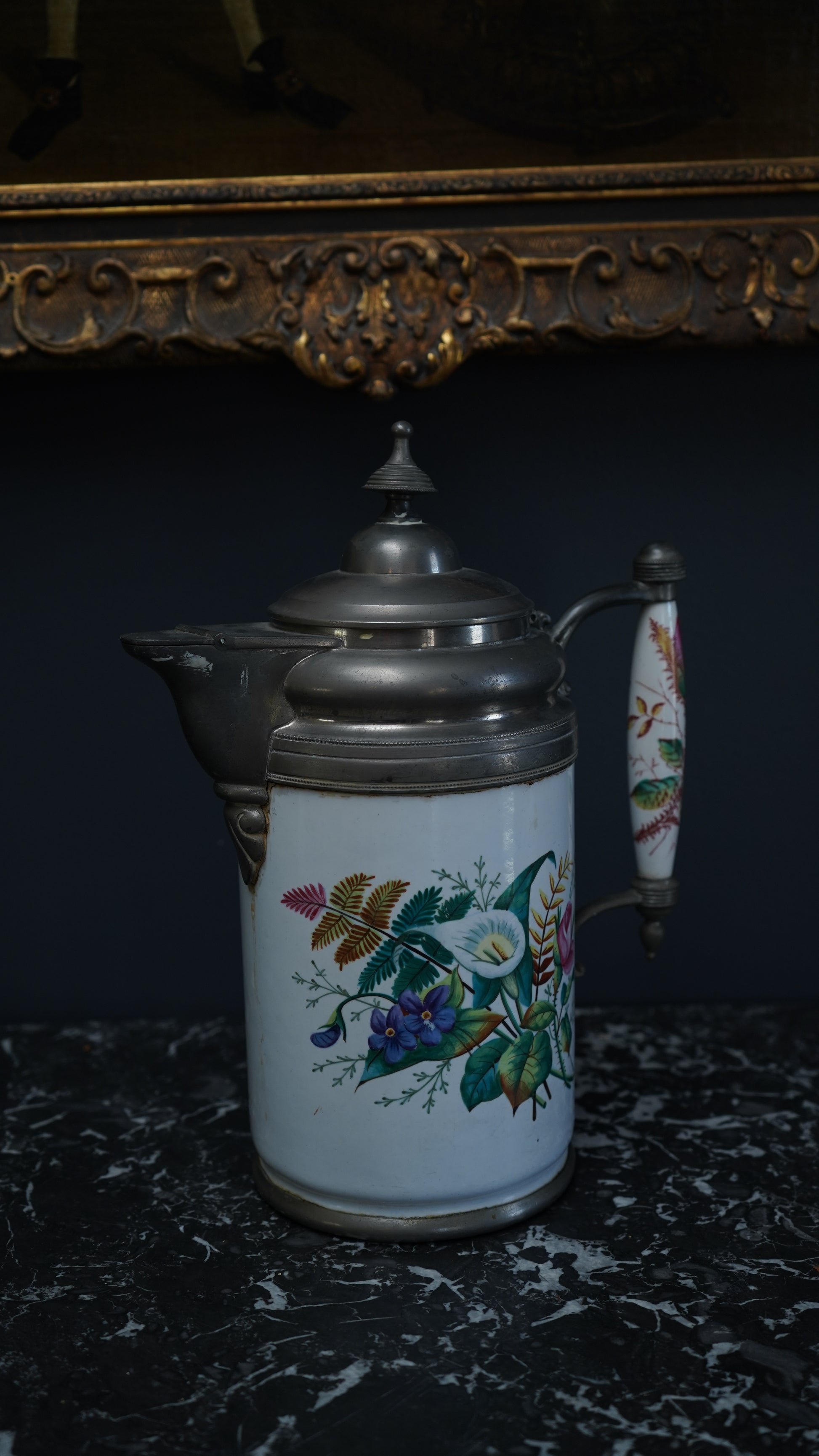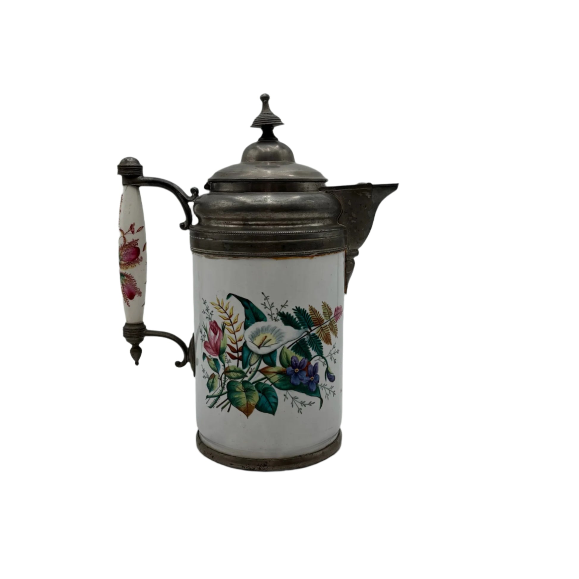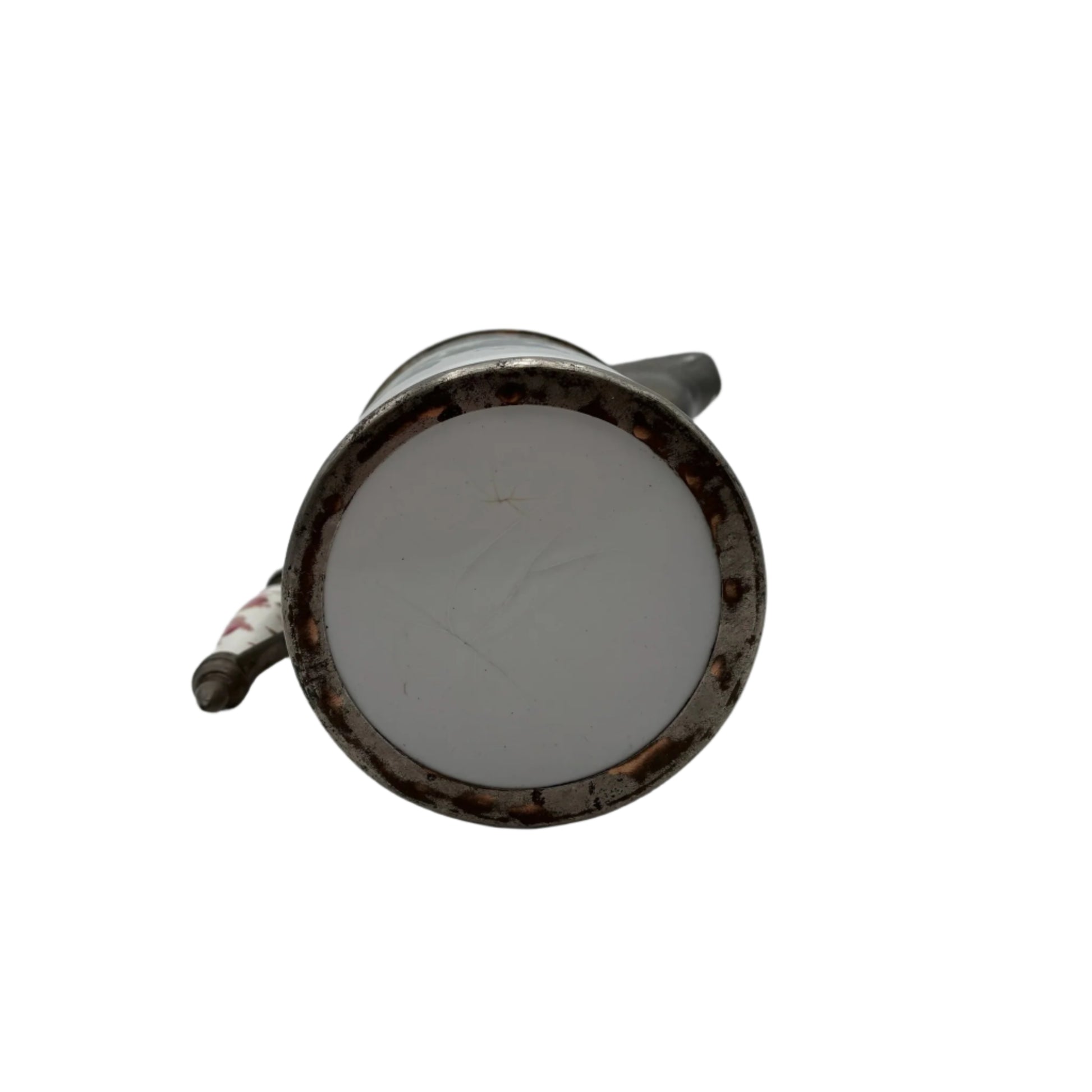 Overall, this mid-19th-century porcelain and pewter-mounted pot is in very good antique condition, with fine crazing and a few small enamel losses, mellow metal patina, and period copper-rivet repairs to the base.