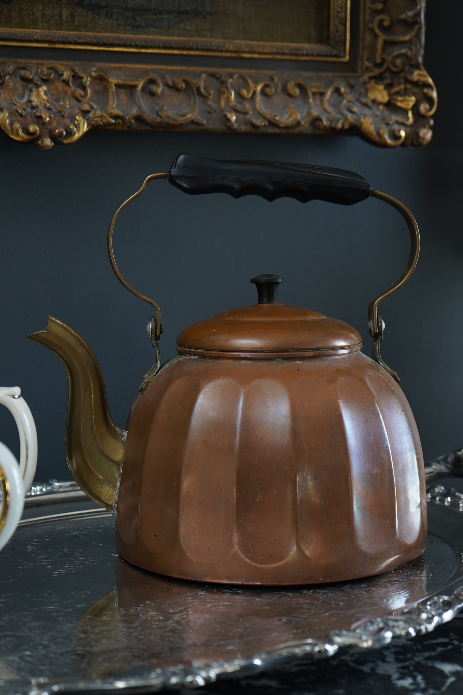 Overall, this mid-century copper kettle is in good condition, with a warm, iridescent patina and light surface wear, intact Bakelite handle and brass spout, and would only need a fresh interior re-tinning to restore full functionality.