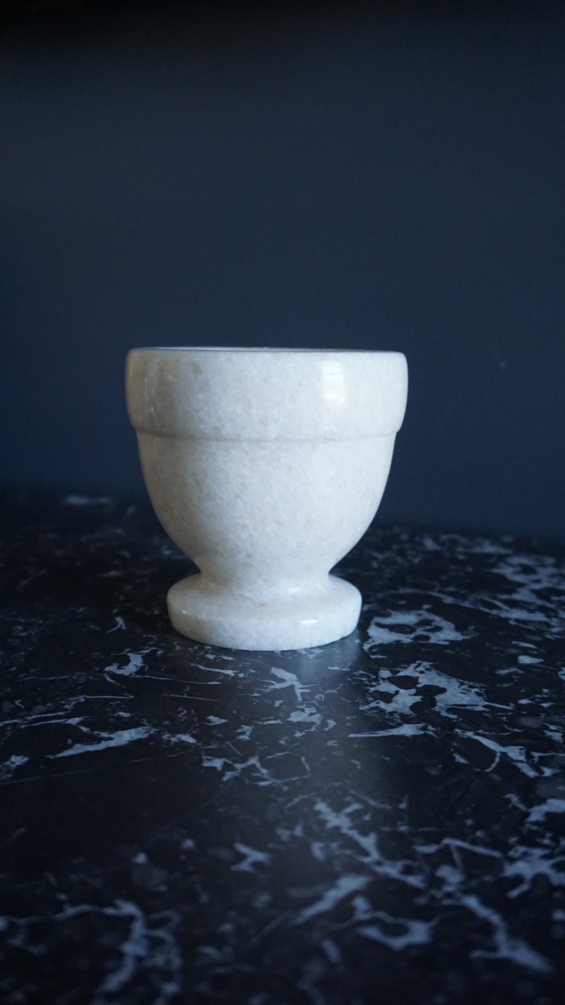The pestle is missing, leaving only the mortar. Some faint natural mineral variations and minor surface irregularities are present, typical of hand-carved alabaster. No major chips or cracks observed.
