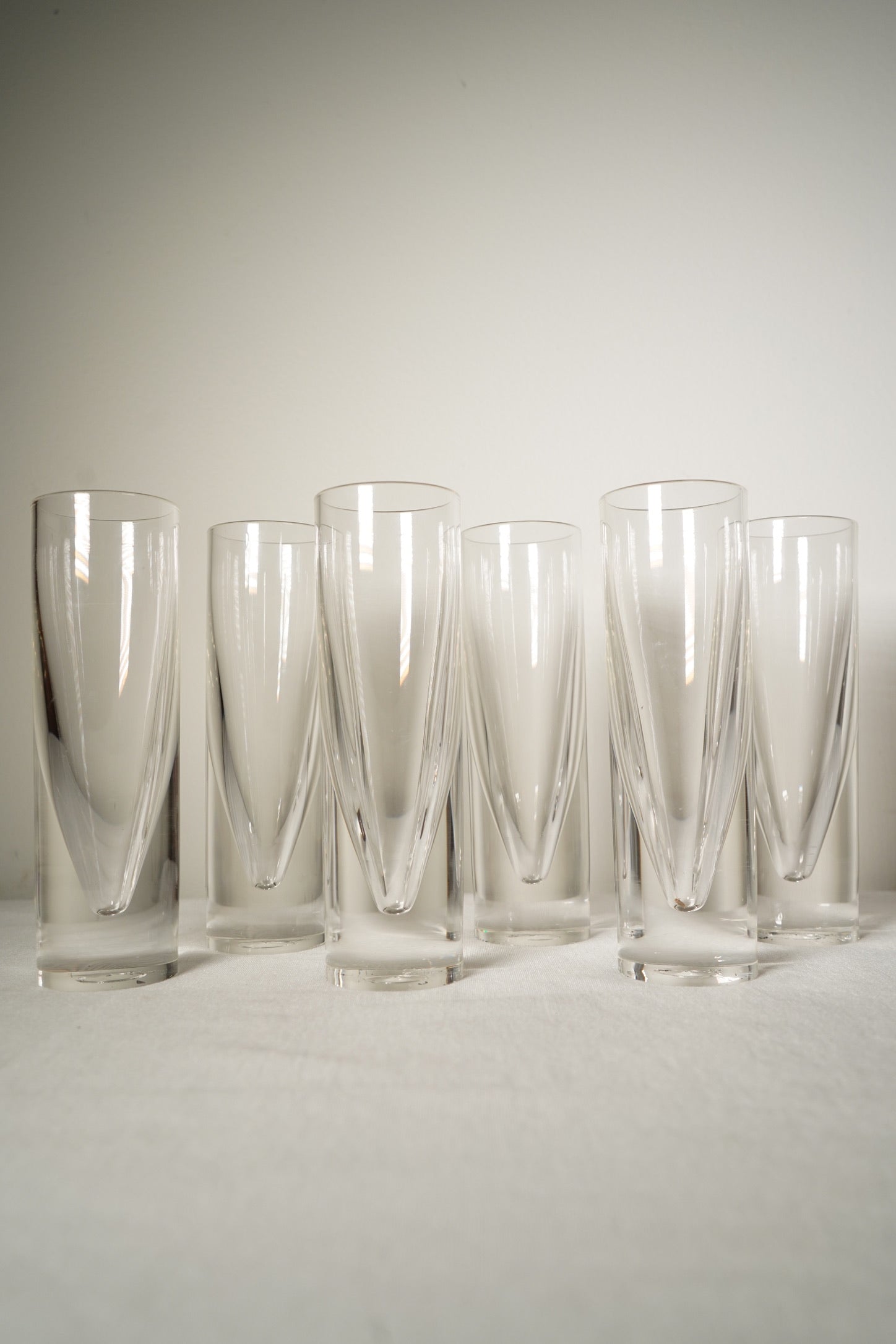 This is a striking set of six sculptural lucite tumblers dating to the 1970s and created in the sleek modernist style associated with Italian designer Alessandro Albrizzi. Each piece is cast from solid clear acrylic and shaped with an elongated internal teardrop form that appears suspended within the cylinder. The result is a clean, architectural silhouette that plays beautifully with light and creates a strong visual presence on a bar cart or drinks cabinet.