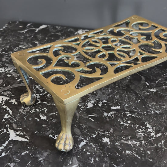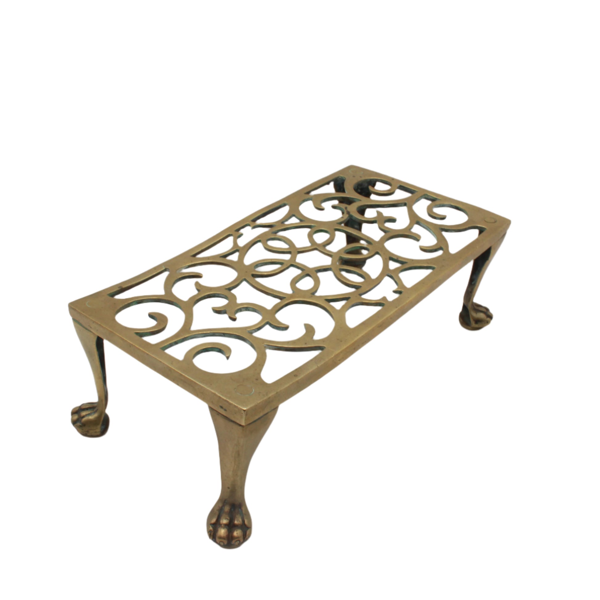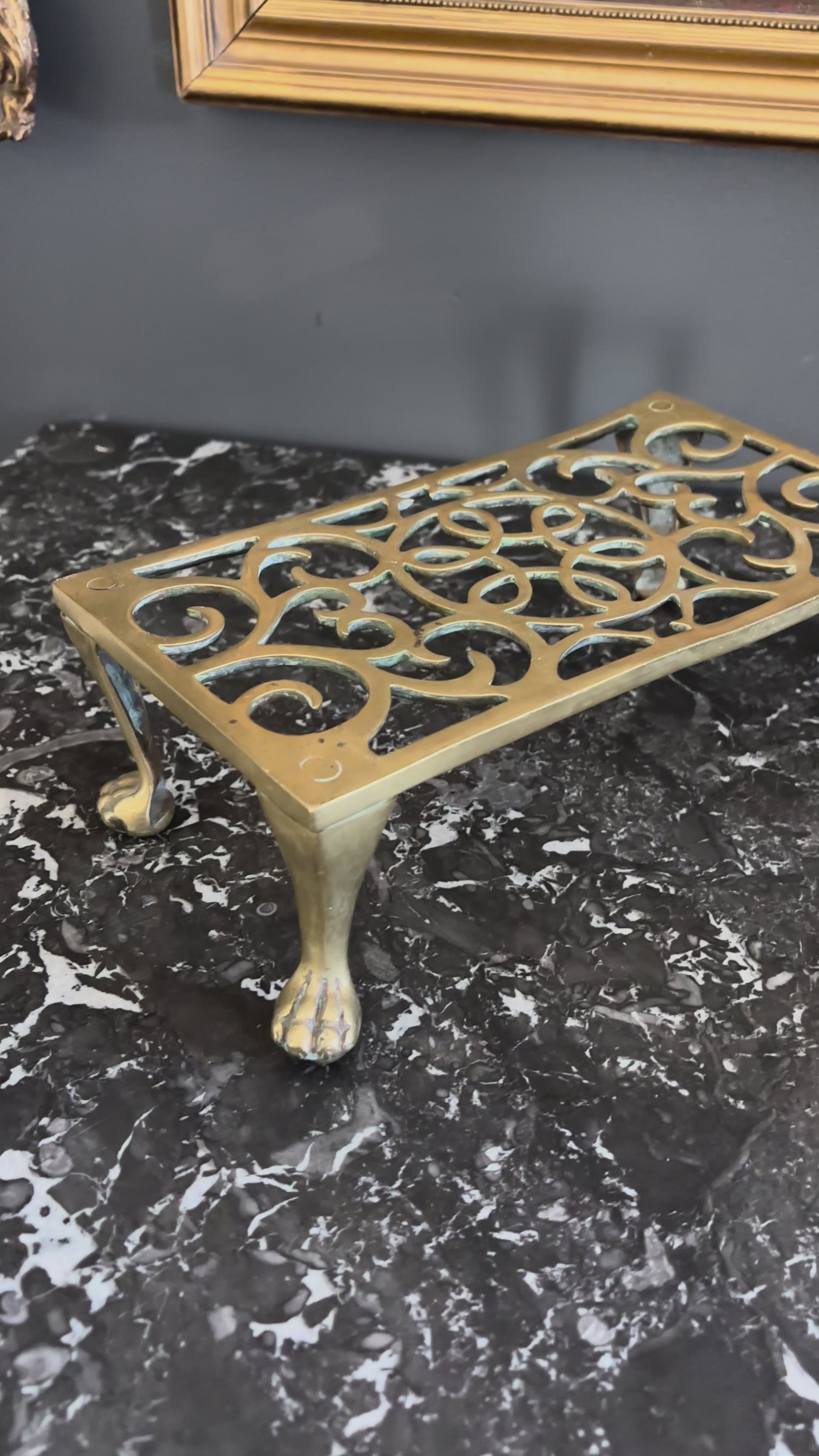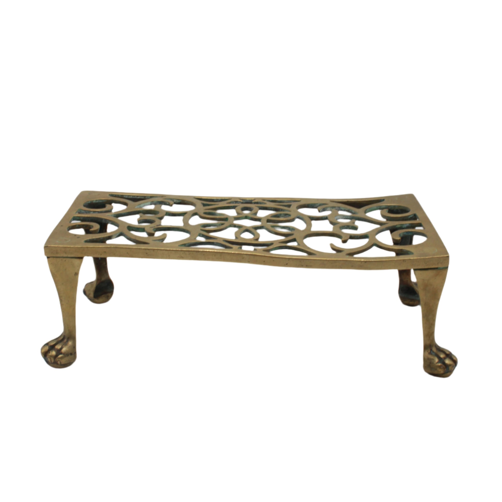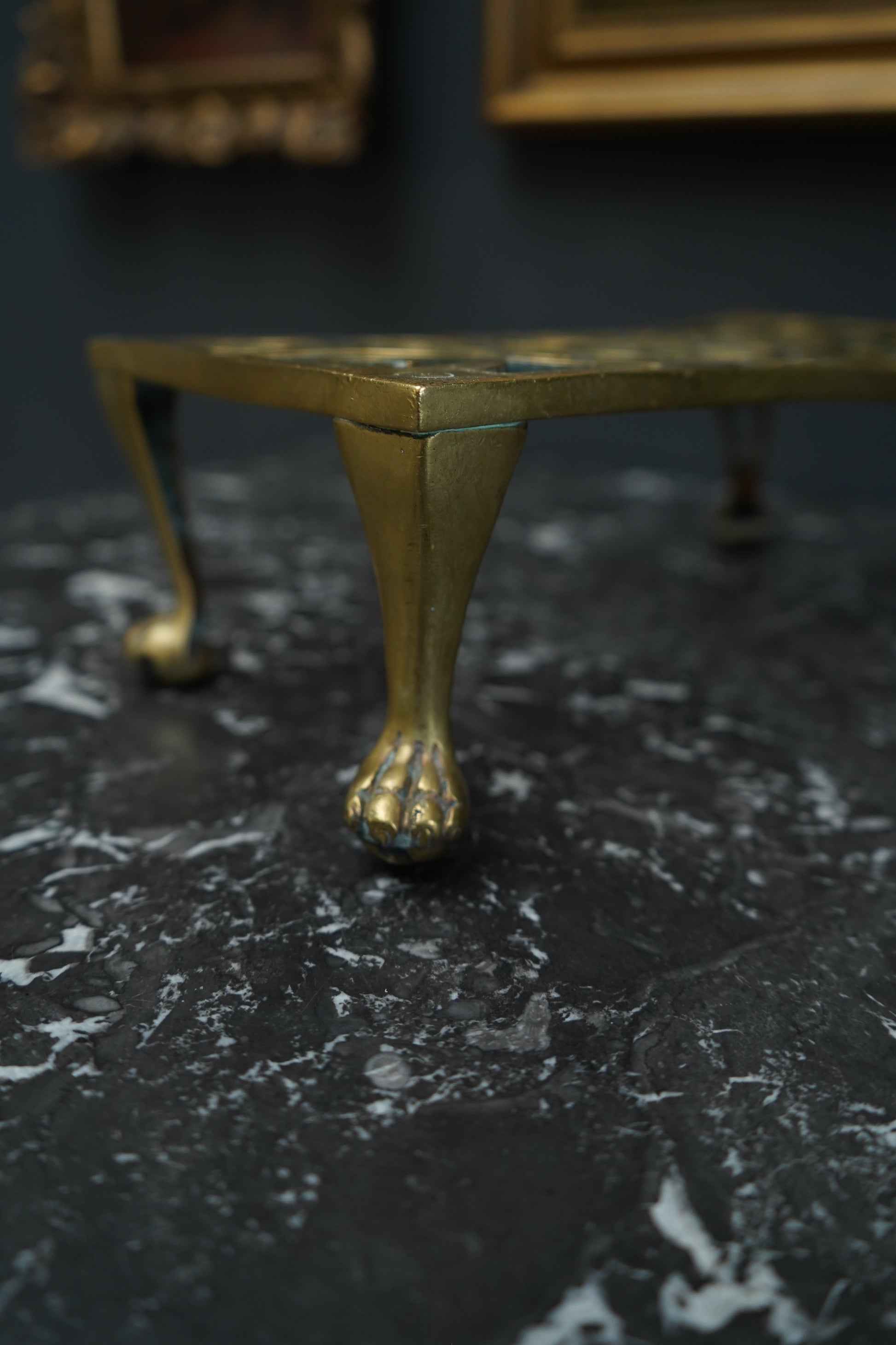 This footman is in good antique condition with age-appropriate wear. The brass surface shows natural patina and areas of verdigris consistent with age and use. Minor surface scratches and casting irregularities are present, which are expected in handcrafted brass pieces of this period. The structure is sturdy and stable, with no significant damage.