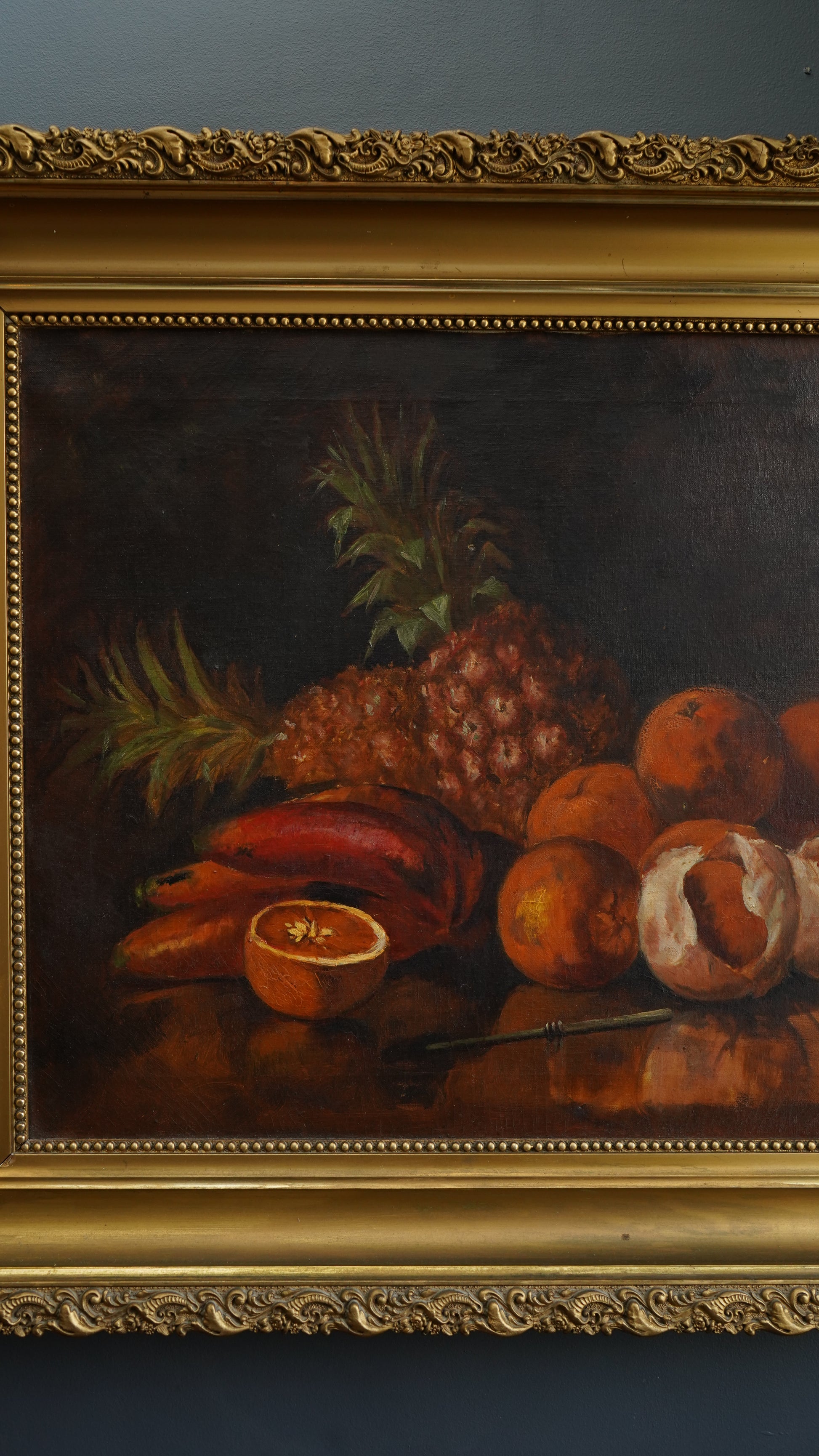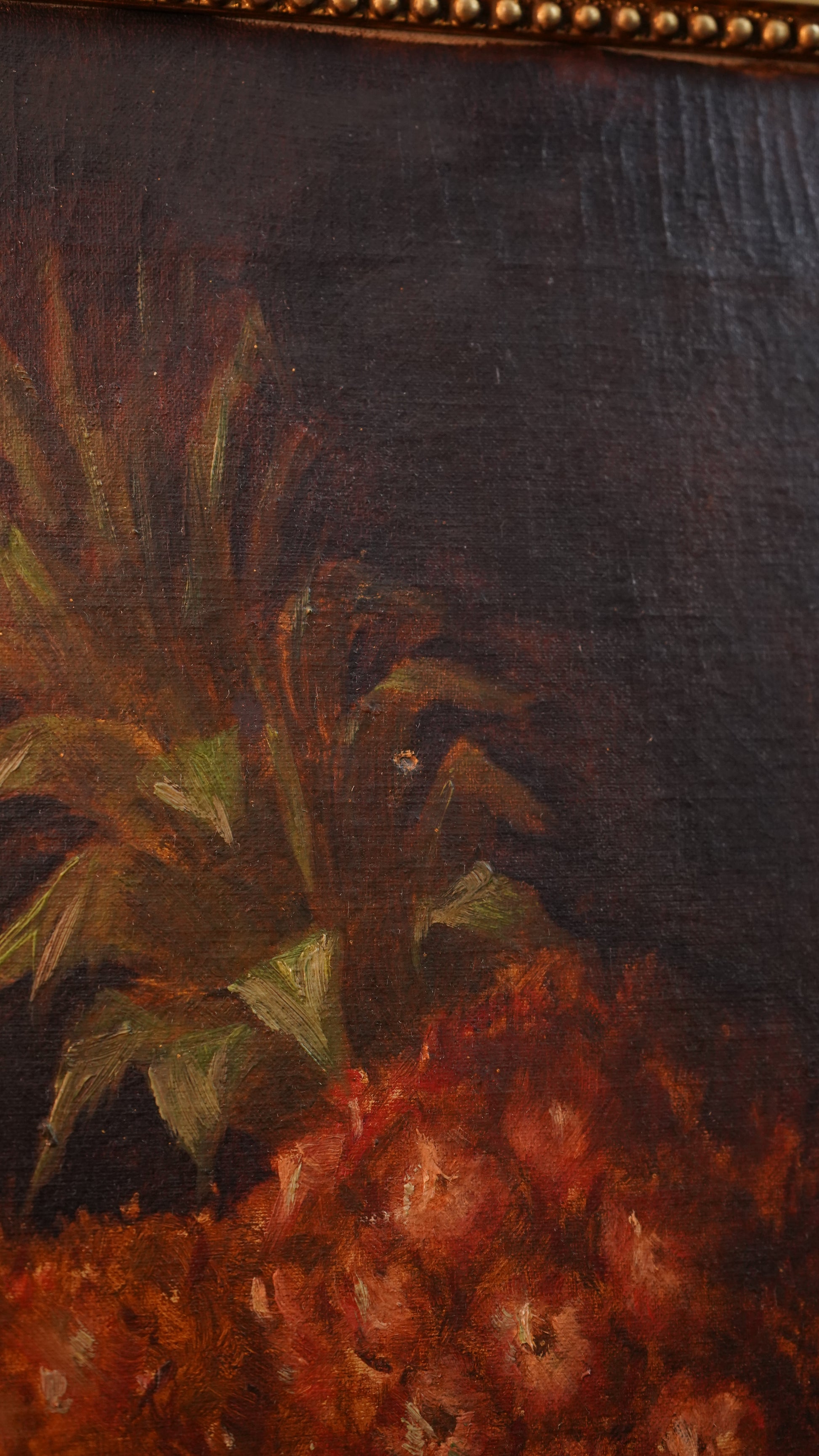 Antique European Still Life Oil Painting with Pineapple and Citrus in Gilded Frame