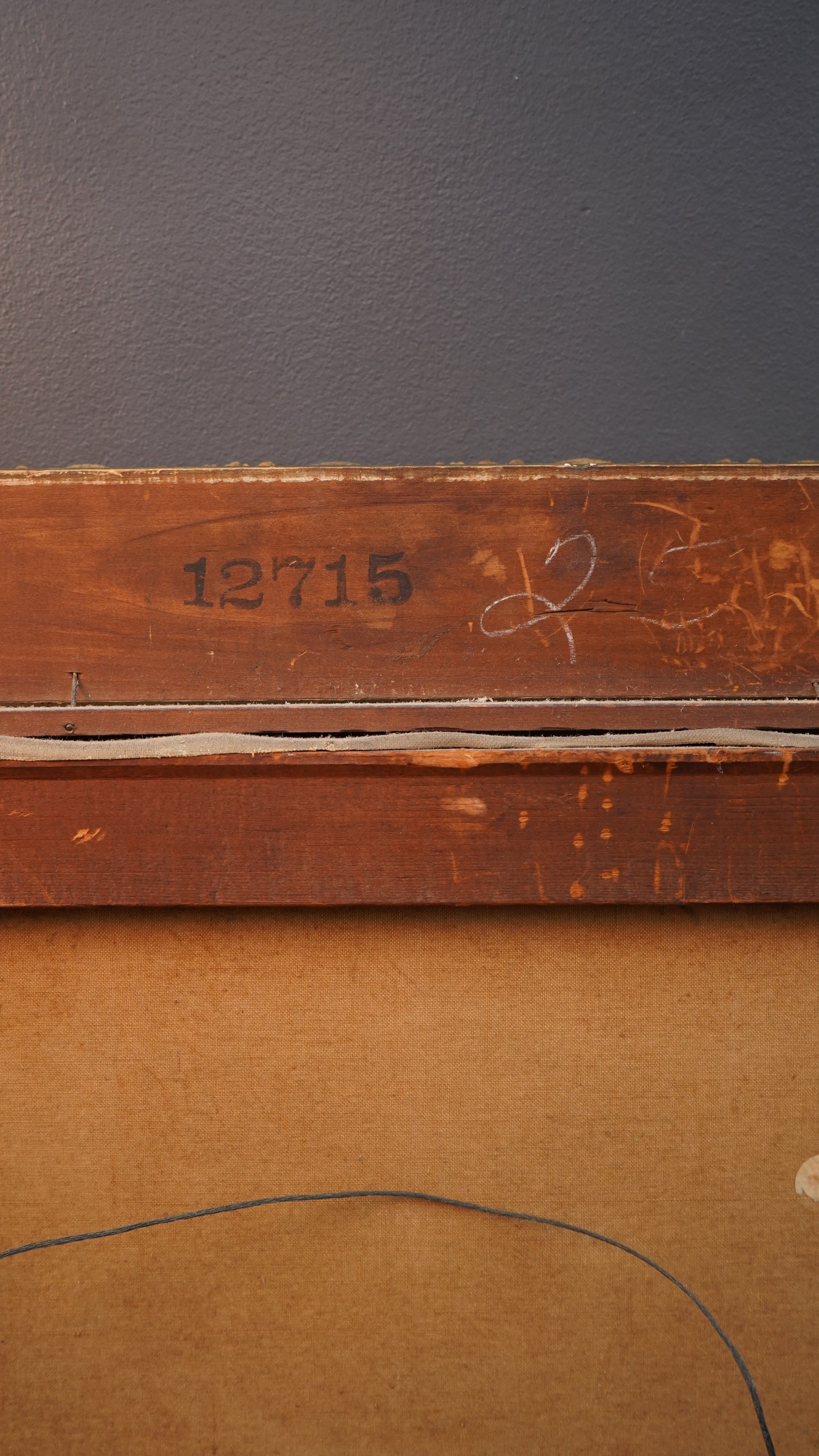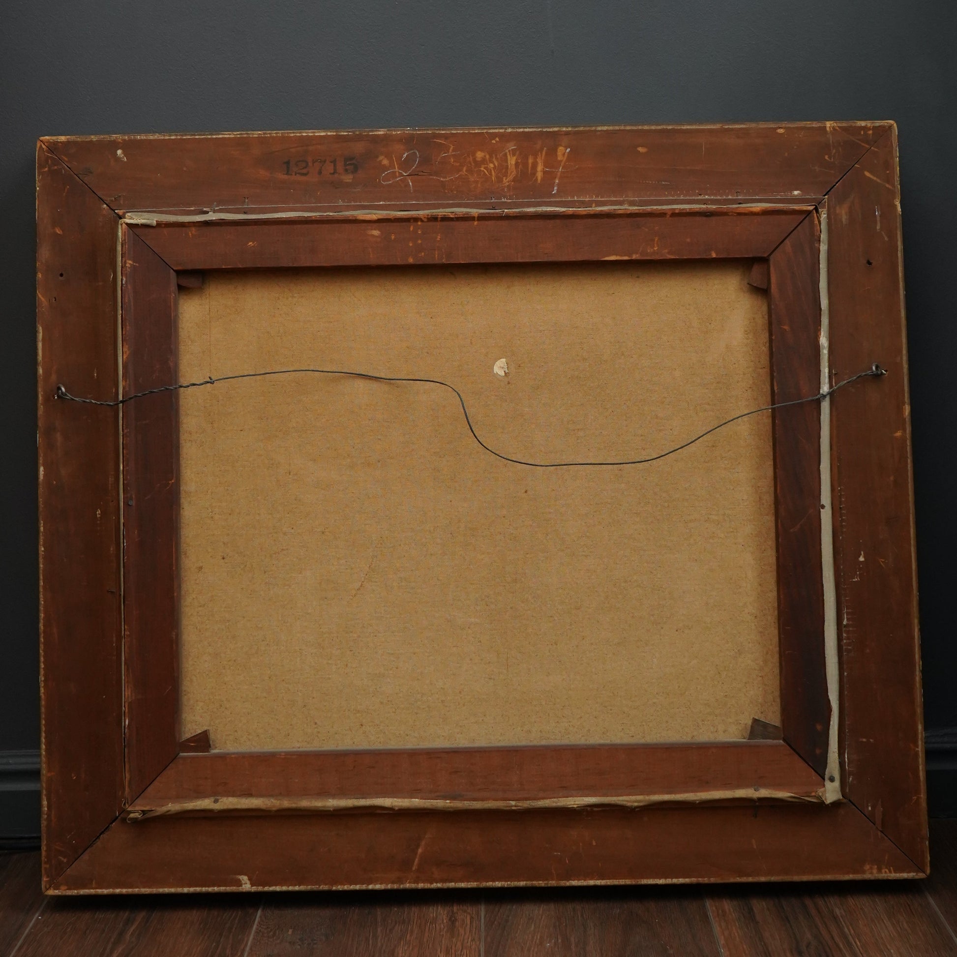 The painting sits in its original gilded gesso frame, which has the classic ornate profile used around the turn of the century. The number stenciled on the back suggests it once passed through an auction house or framing studio. Even with imperfections, the piece has strong decorative impact and an authentic antique character.