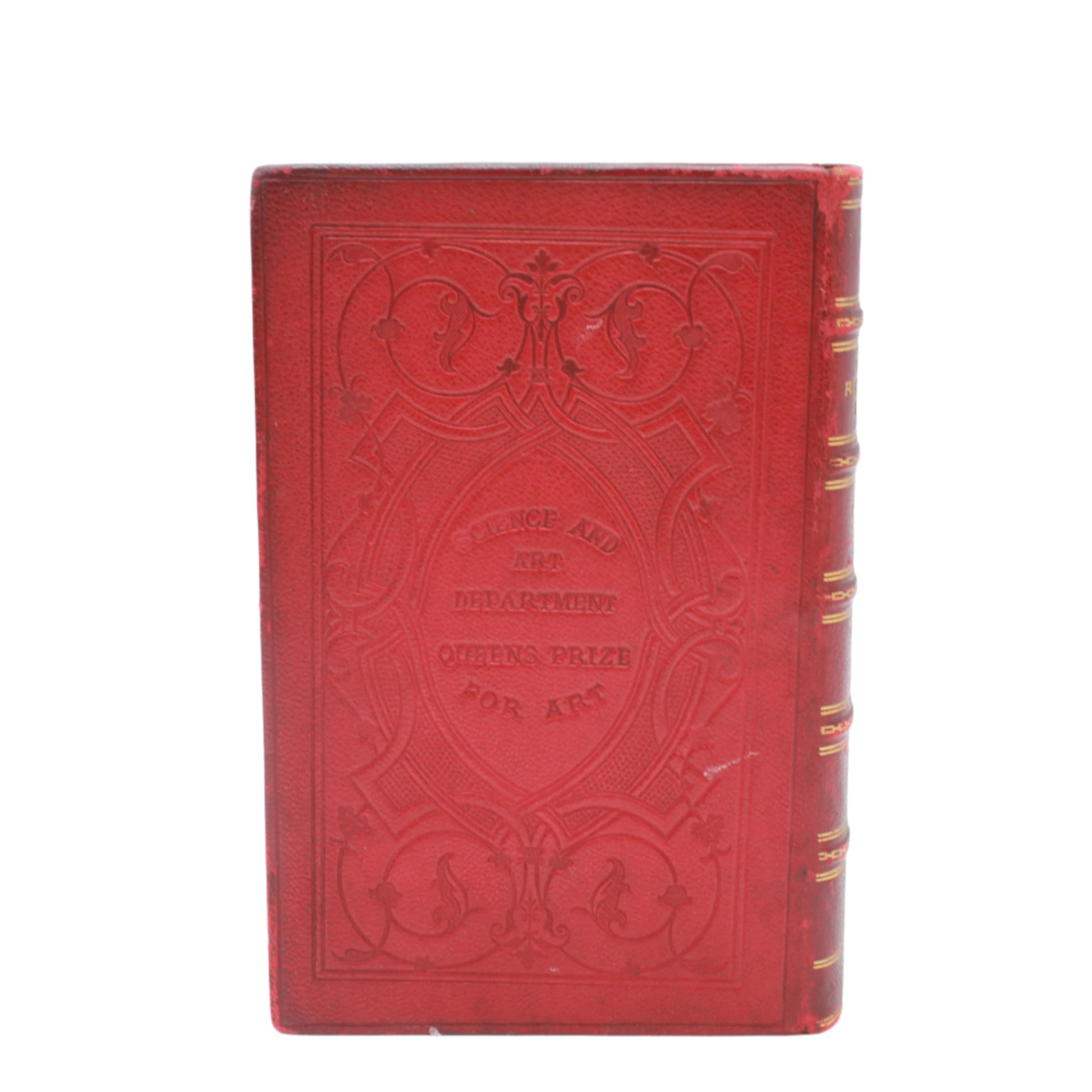 The historical context of this book lies in the broader Victorian reverence for earlier figures who helped shape Britain’s cultural institutions. Reynolds’s insights on aesthetics, composition, and the education of artists held continued importance in a period that both celebrated its national heritage and sought to professionalize the study of art. This particular copy bears a lavish red leather binding with gilt tooling, prominently stamped on the front cover with “Science and Art Department Queen’s Prize for Art.” Such prize bindings were awarded as honors, indicating the high regard in which Reynolds’s works were held, as well as the 19th-century tradition of commemorating academic or artistic achievement with finely bound books. Gilt rules and decorative flourishes adorn the spine, marked “Sir J. Reynolds’s Works Vol. II,” underscoring the volume’s distinguished status.