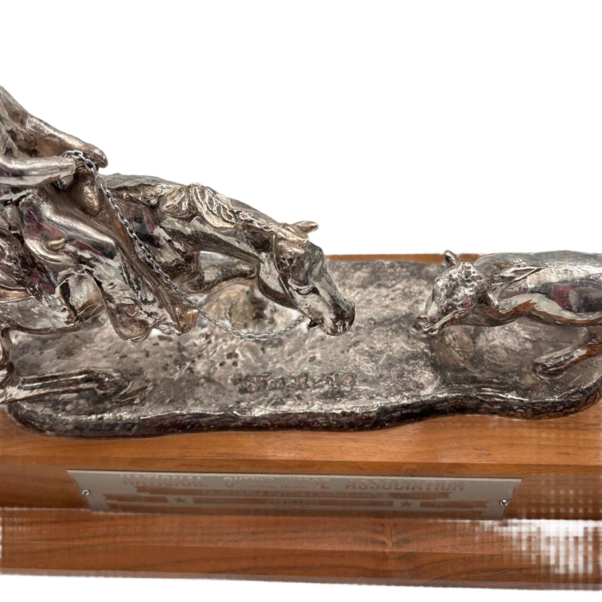 This trophy is in good vintage condition, with light surface wear and natural patina consistent with age. The silver-toned metal sculpture remains structurally sound and securely mounted to the hardwood base, which is clean and stable with only minor surface marks. Please note: the original chain that once connected the horse and calf is no longer present. This detail does not affect the overall composition or display integrity but is reflected in the pricing. The engraved plaque is crisp and clearly legible, noting the 1975 award and recipient.