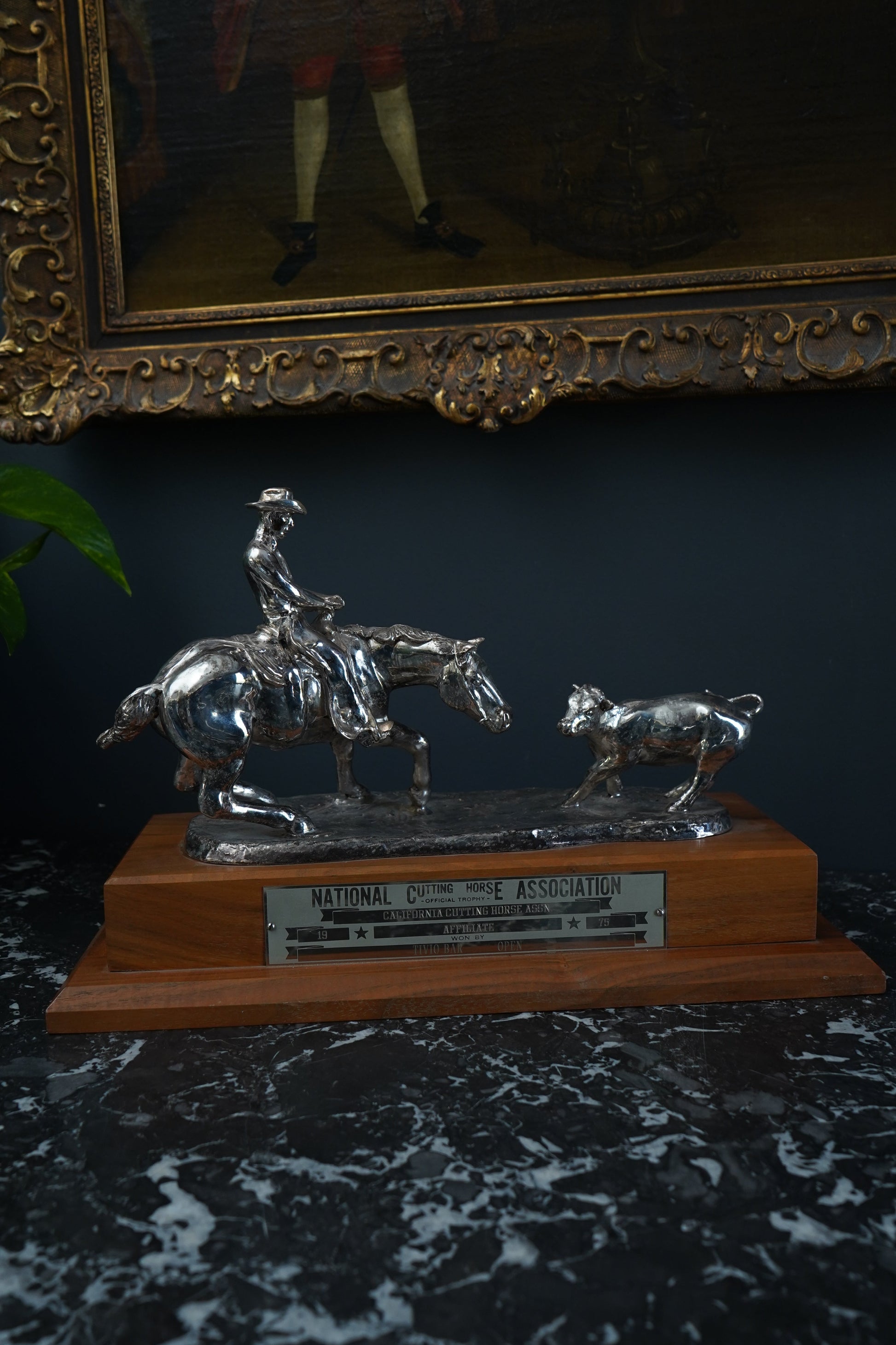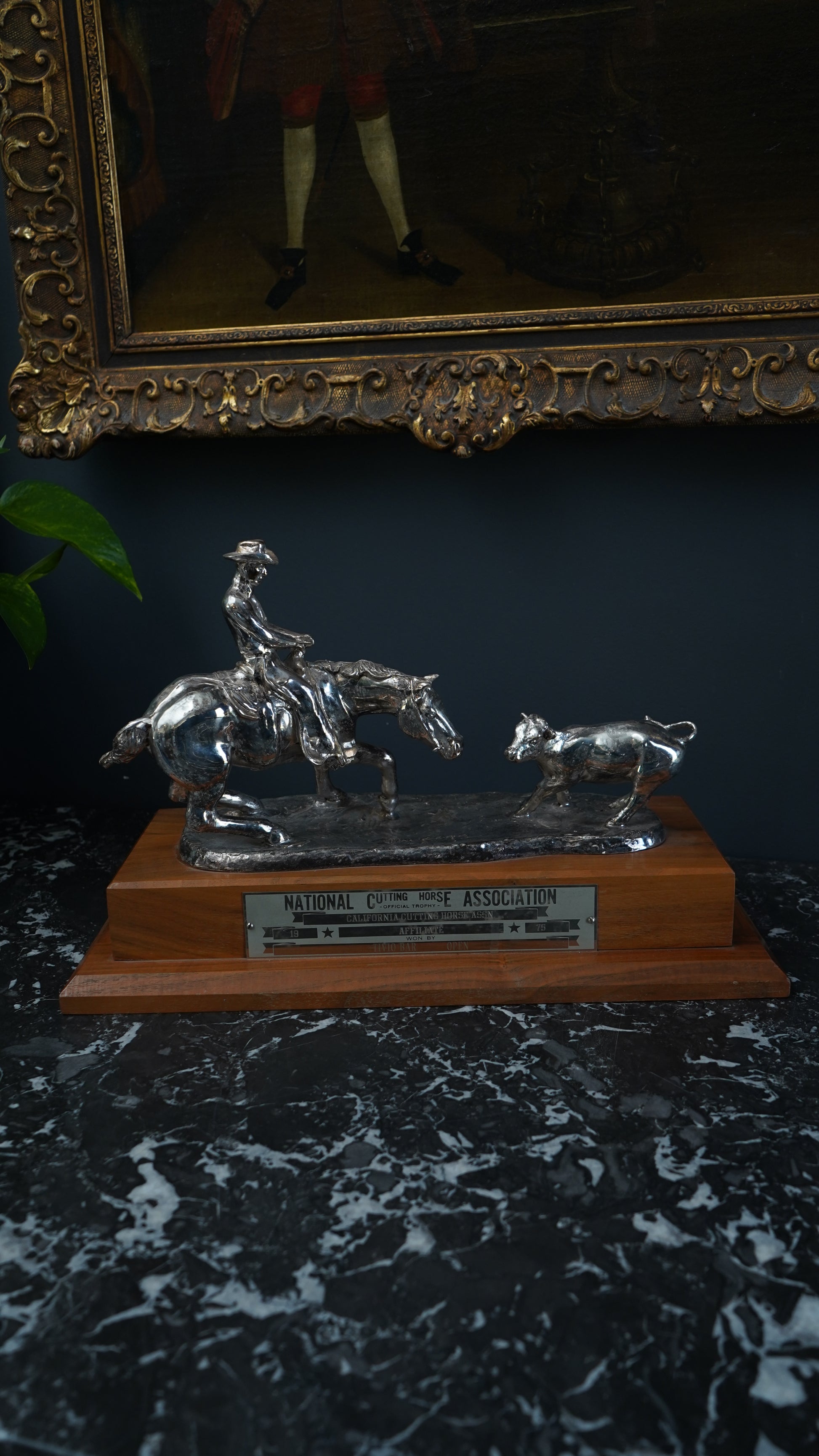 This 1975 National Cutting Horse Association (NCHA) trophy represents a genuine artifact of American Western sporting heritage, presented by the California Cutting Horse Association to the champion horse Two Bar Cody in the Open division. Crafted in expressive silver-toned metal and mounted on a sturdy hardwood base, the sculpture captures a cowboy in motion, skillfully separating a calf from the herd, an iconic scene emblematic of the cutting horse tradition. Signed by Glenda Starlie, a noted artist of Western-themed award sculptures from the 1970s, the piece combines fluid movement, precise anatomical detail, and a distinguished vintage patina. It holds significant decorative and collectible value, appealing to equestrian aficionados, admirers of ranch-style decor, and collectors of Americana art.