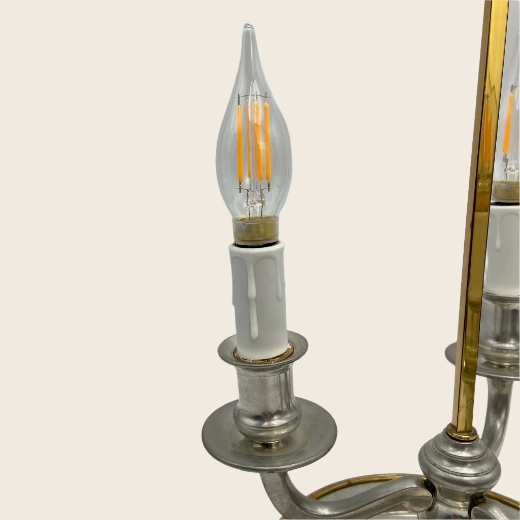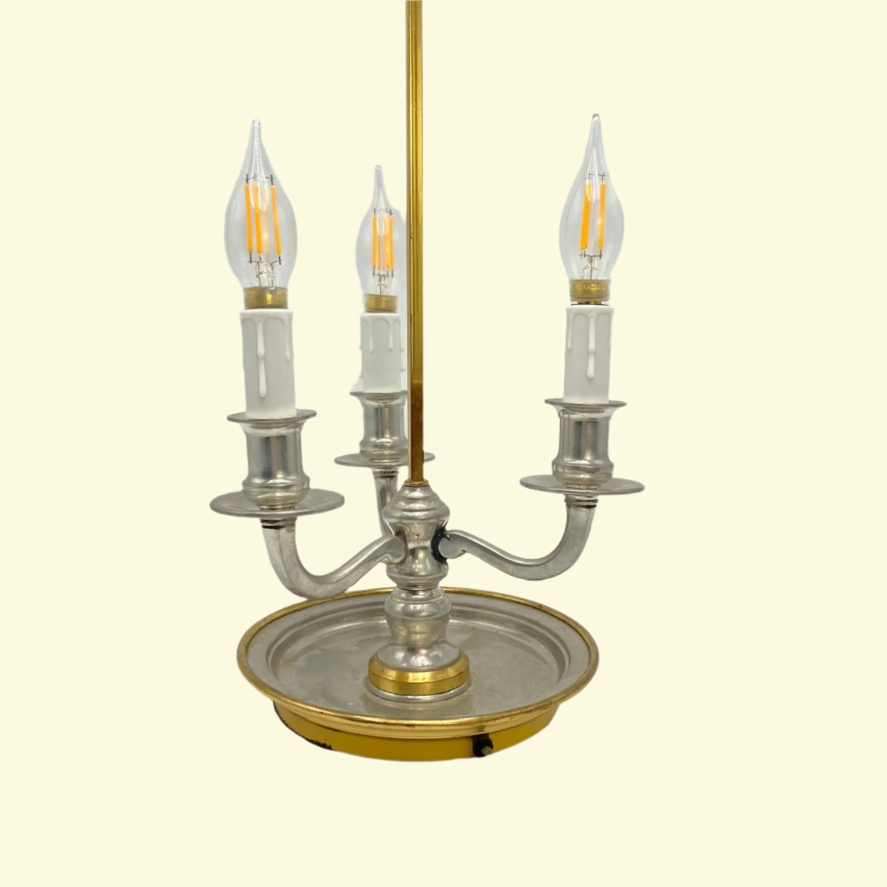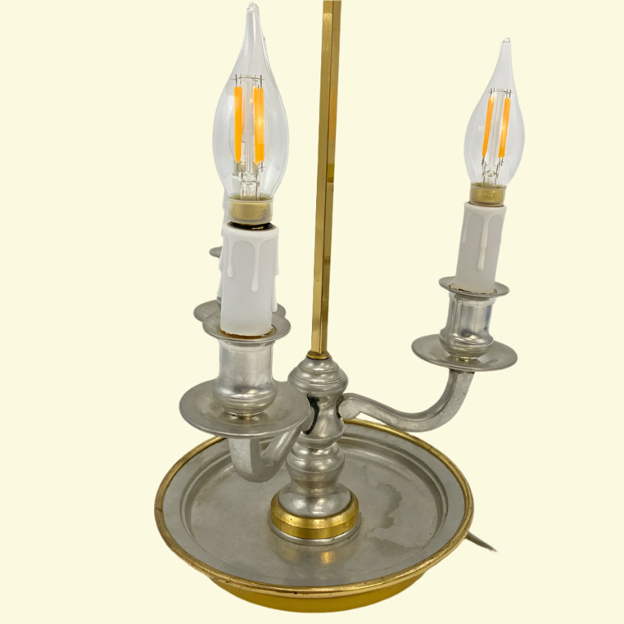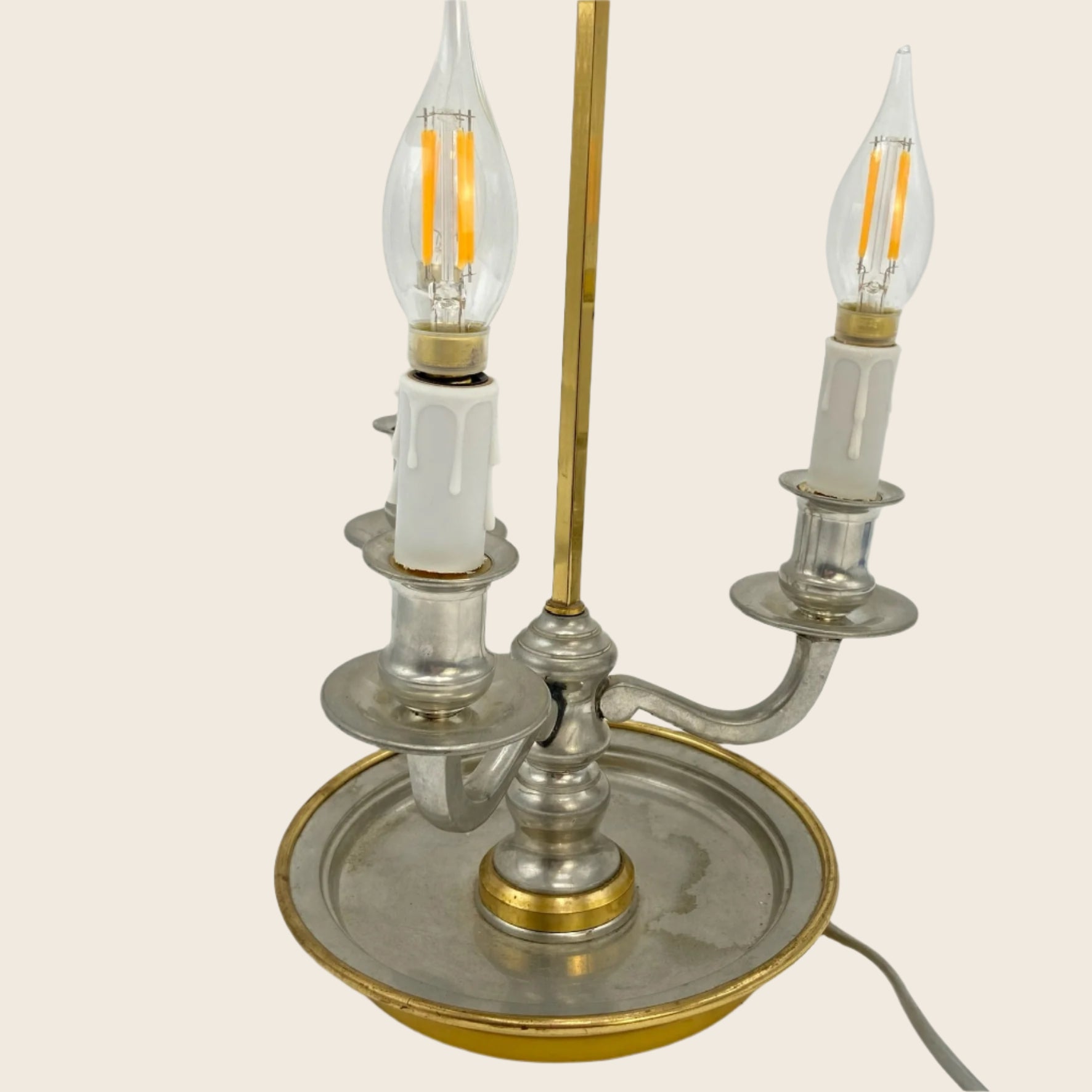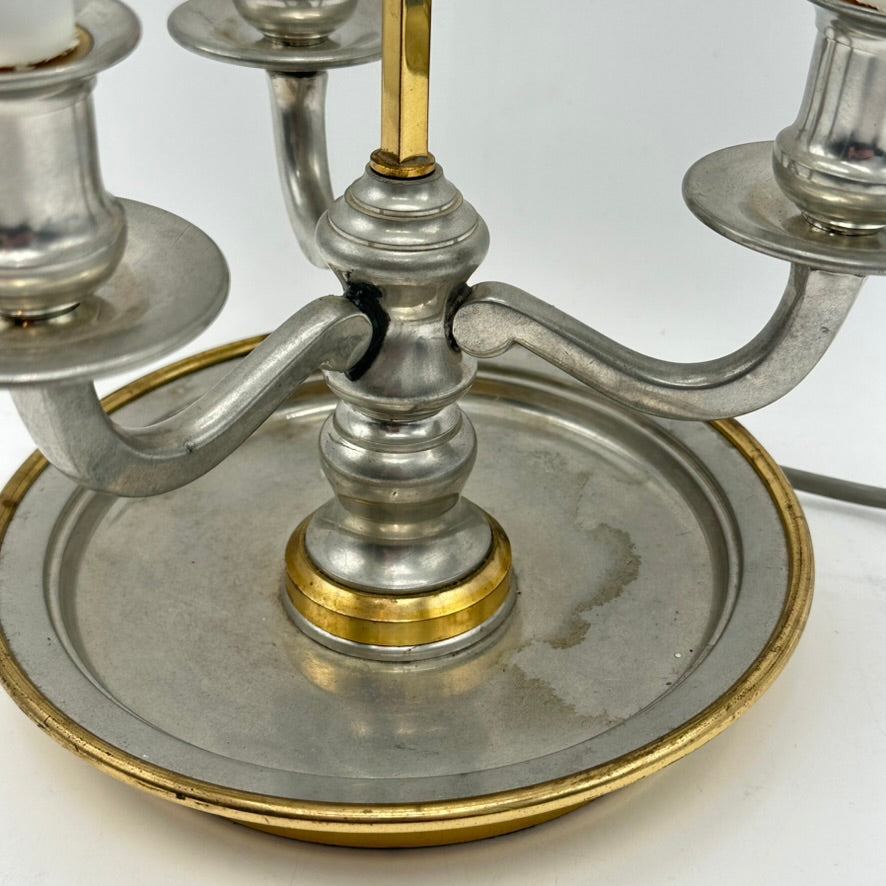 This vintage French Bouillotte lamp shows some character with a visible repair on one arm and a slightly leaning center piece. The silver and brass surfaces have developed a charming patina. The maroon metal shade features minor scratches and a few dents, likely caused from the inside out. Additionally, the shade has been cold welded to the adjustable base for stability.