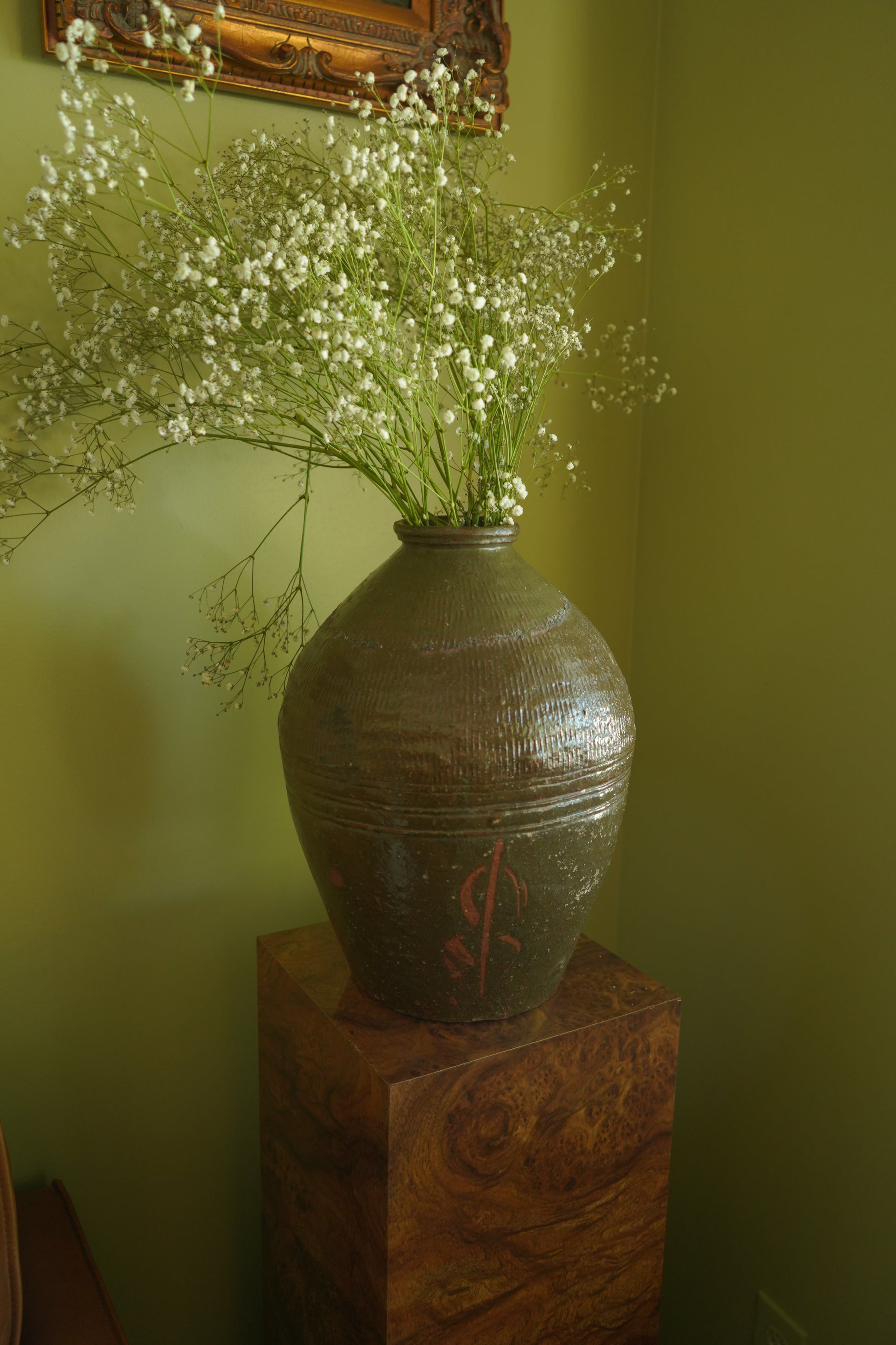 Vintage Chinese Stoneware Oil Jar with Ash Glaze, Rustic Pottery Vessel, 14.25 Inches