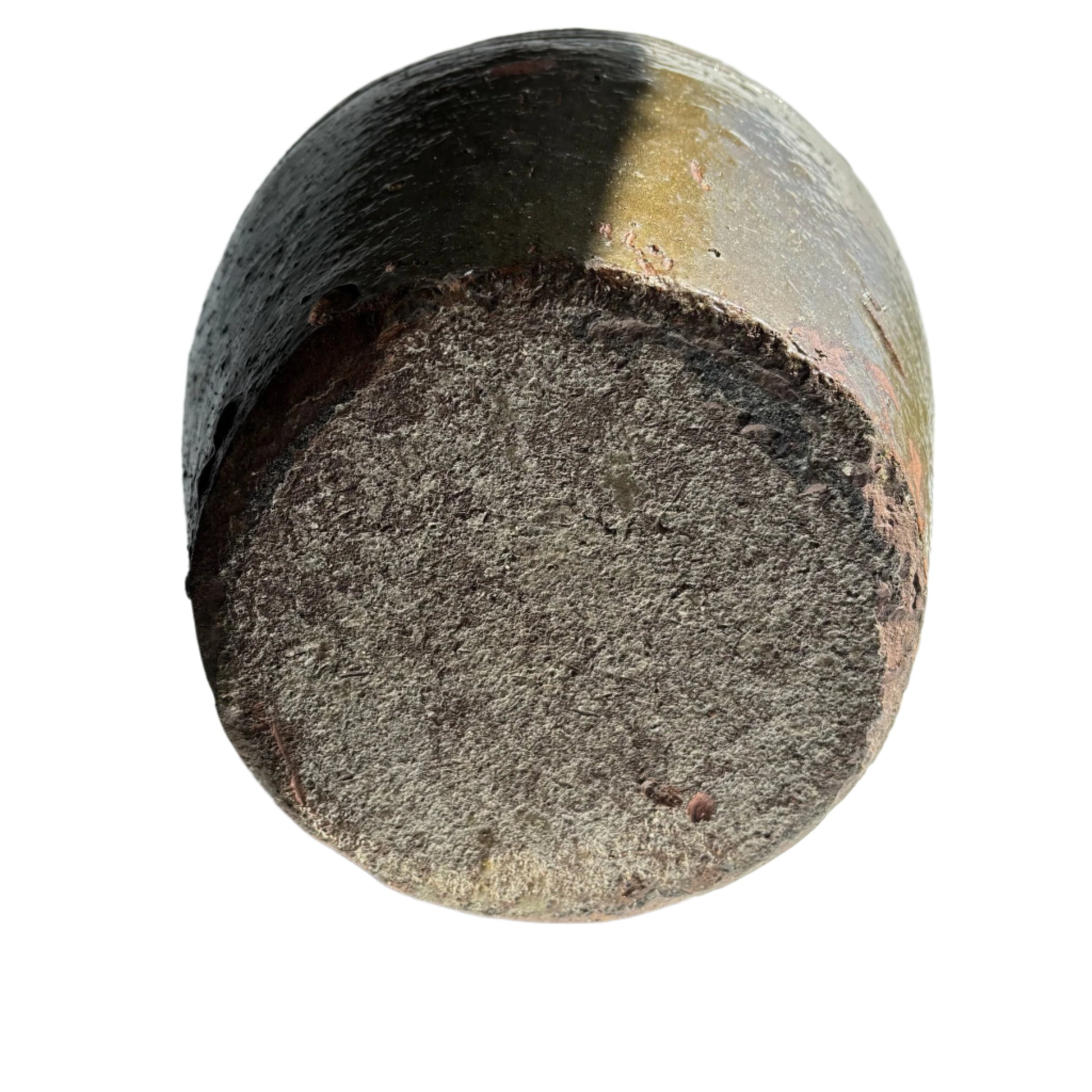 This vintage oil jar is in very good condition with surface wear and glaze variation consistent with its age and original use. Minor rim chips and small imperfections from the firing process are present, contributing to its authentic, rustic look. The glaze shows rich tonal variation and natural patina throughout. The impressed mark near the shoulder is partially visible under the glaze. The base is worn but stable, with no structural damage or repairs.