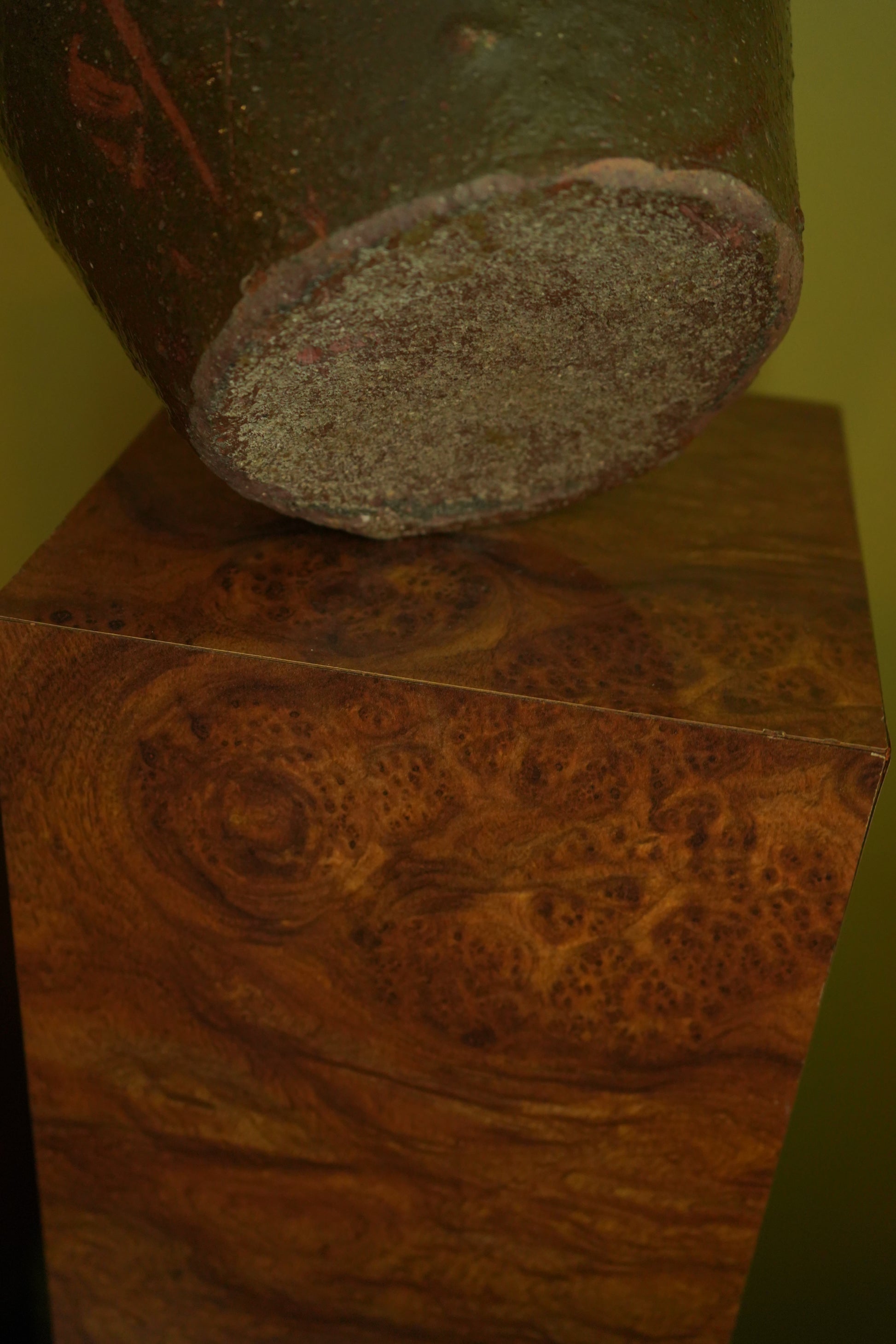 The jar features a deeply textured surface from combed or paddle finishing, encircled by incised bands, and finished in an earthy olive-to-brown ash glaze. The irregularities in glaze and form speak to its utilitarian origins and natural wood-fired kiln process, likely in a southern dragon kiln.