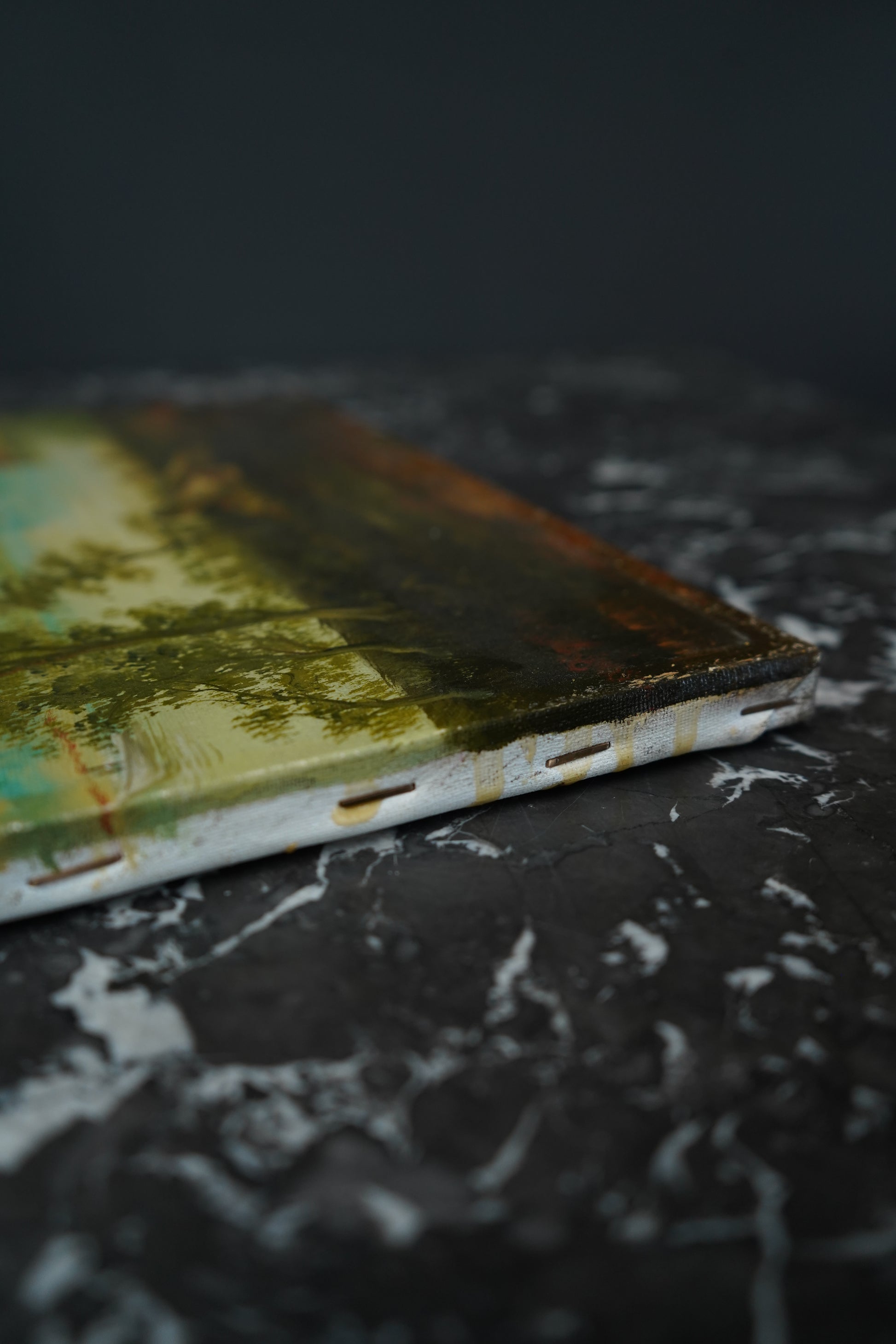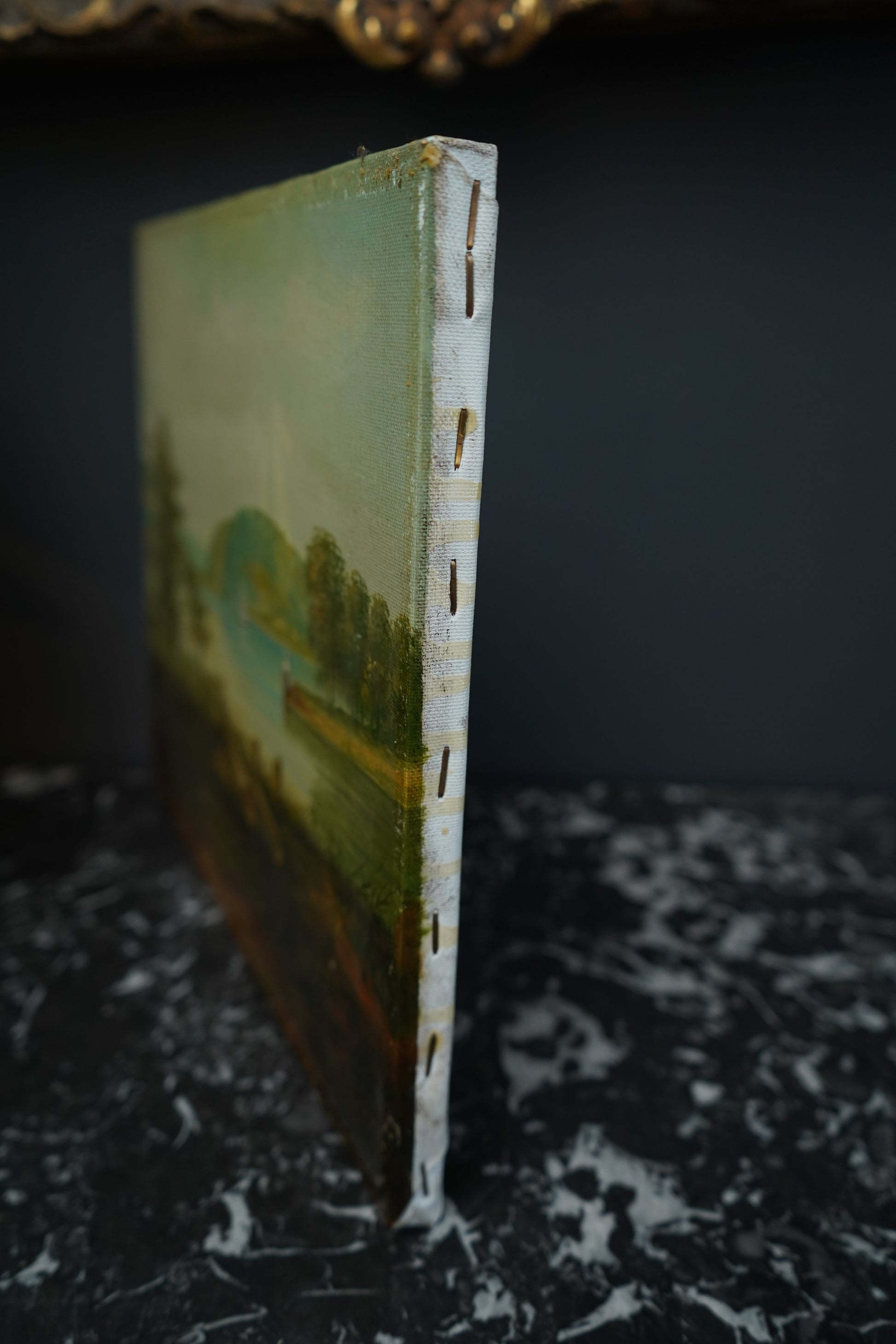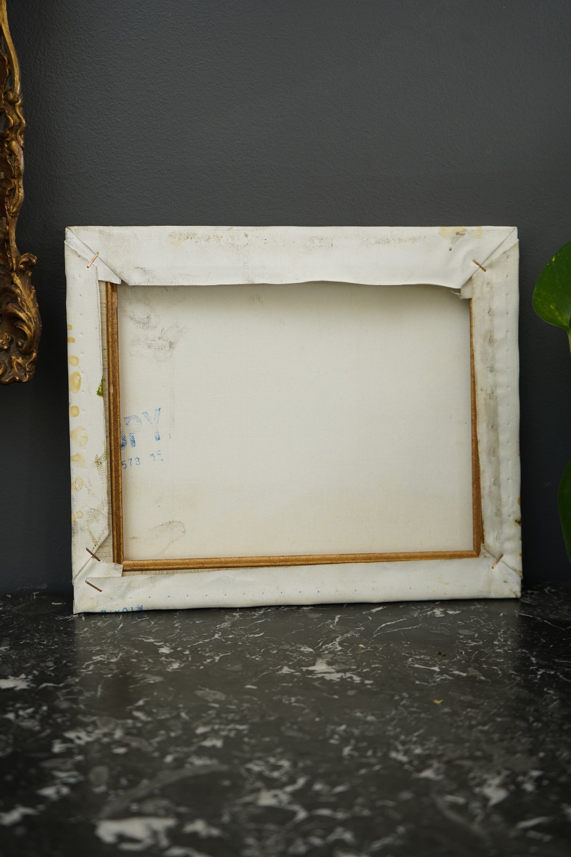 The painting is in overall good vintage condition. The canvas remains well-stretched and stable, with no signs of tearing or relining. There is light surface wear and scattered areas of age-related spotting along the edges, particularly at the lower border, which does not detract from display. The reverse shows a clean, bright canvas with a supplier’s stamp, indicating mid 20th-century production. The piece is currently unframed, ready to be displayed as is or paired with a frame of your choice.