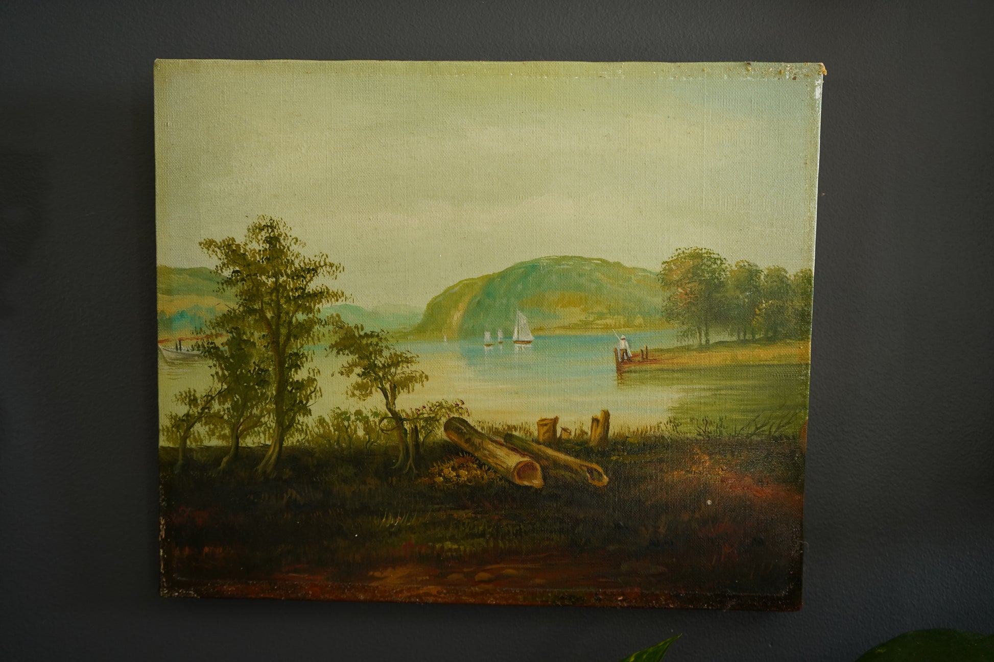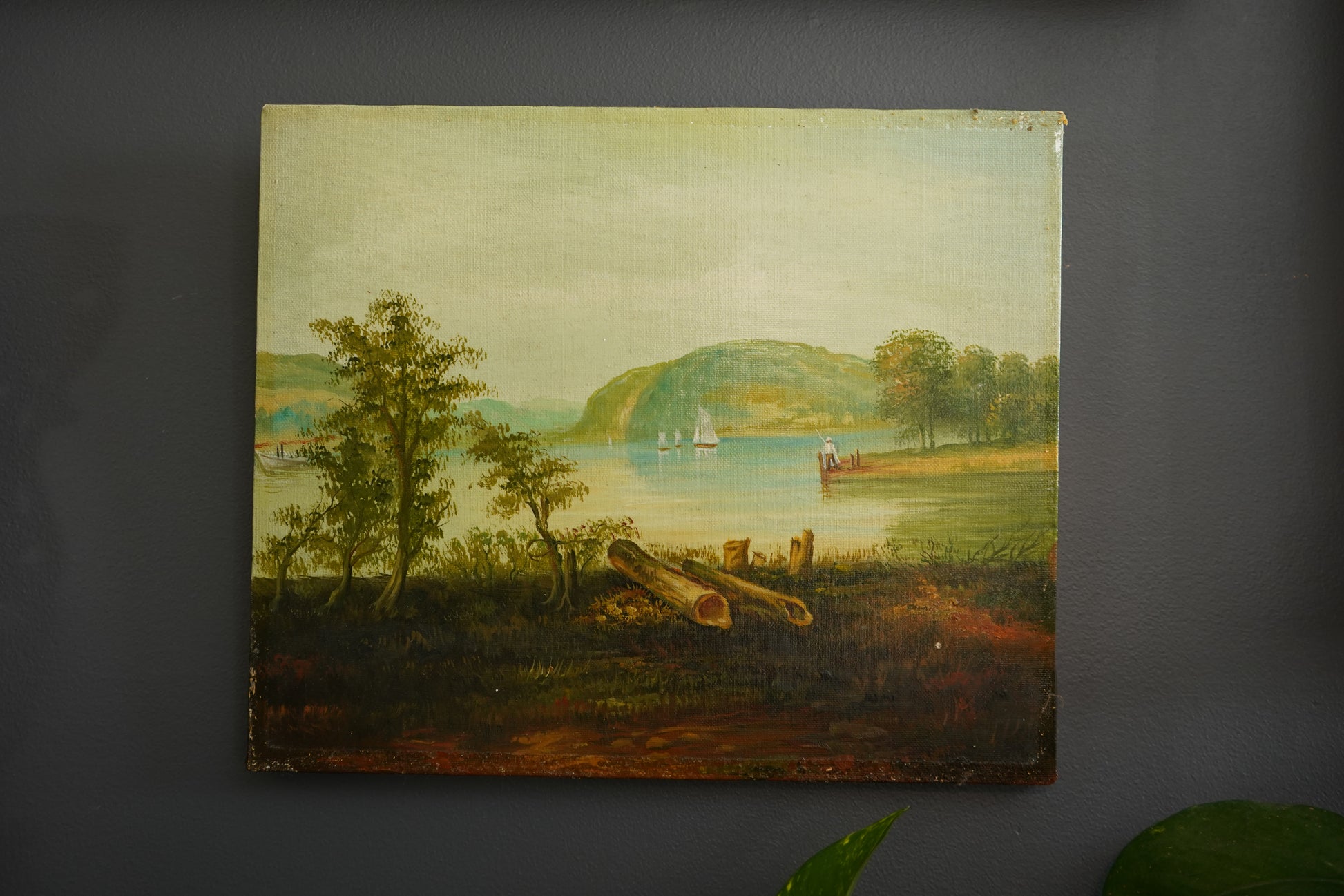 Vintage Hudson River School Style Oil on Canvas Landscape with Sailboats, Mid 20th Century Unframed