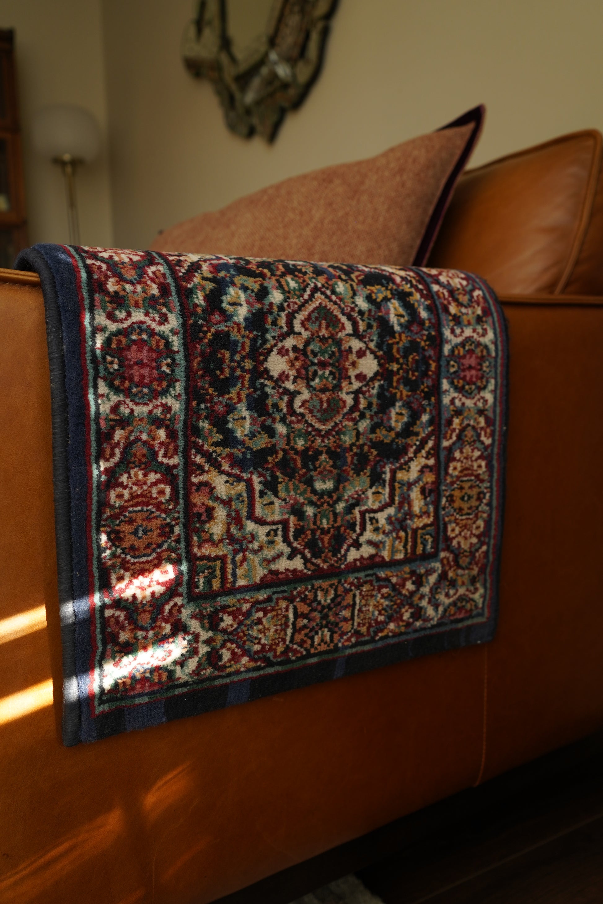 This petite Persian style scatter rug delivers old world pattern in a compact size. The design centers on a lobed medallion with floral cartouches and a Shah Abbas palmette border in navy, oxblood, teal, mustard, and ivory. Power loomed in Belgium or Turkey circa 1975 to 1995, the dense cut pile reads plush and the palette layers beautifully with leather, oak, brass, and English country styling. Style it on a console or nightstand, under a tray or planter, or as a small entry mat. Clean, flat, and ready to use.